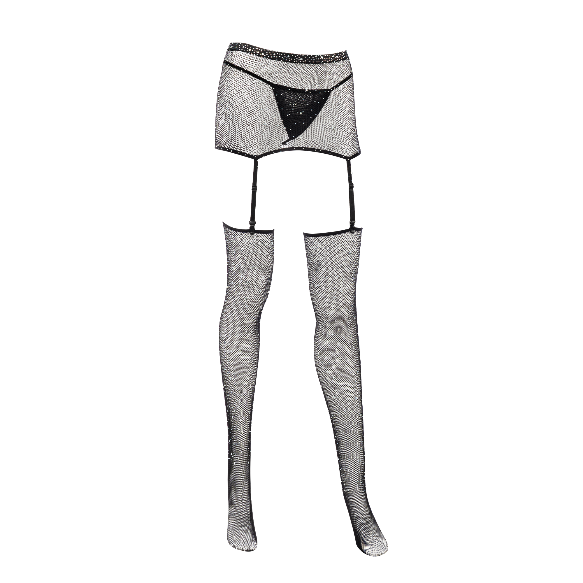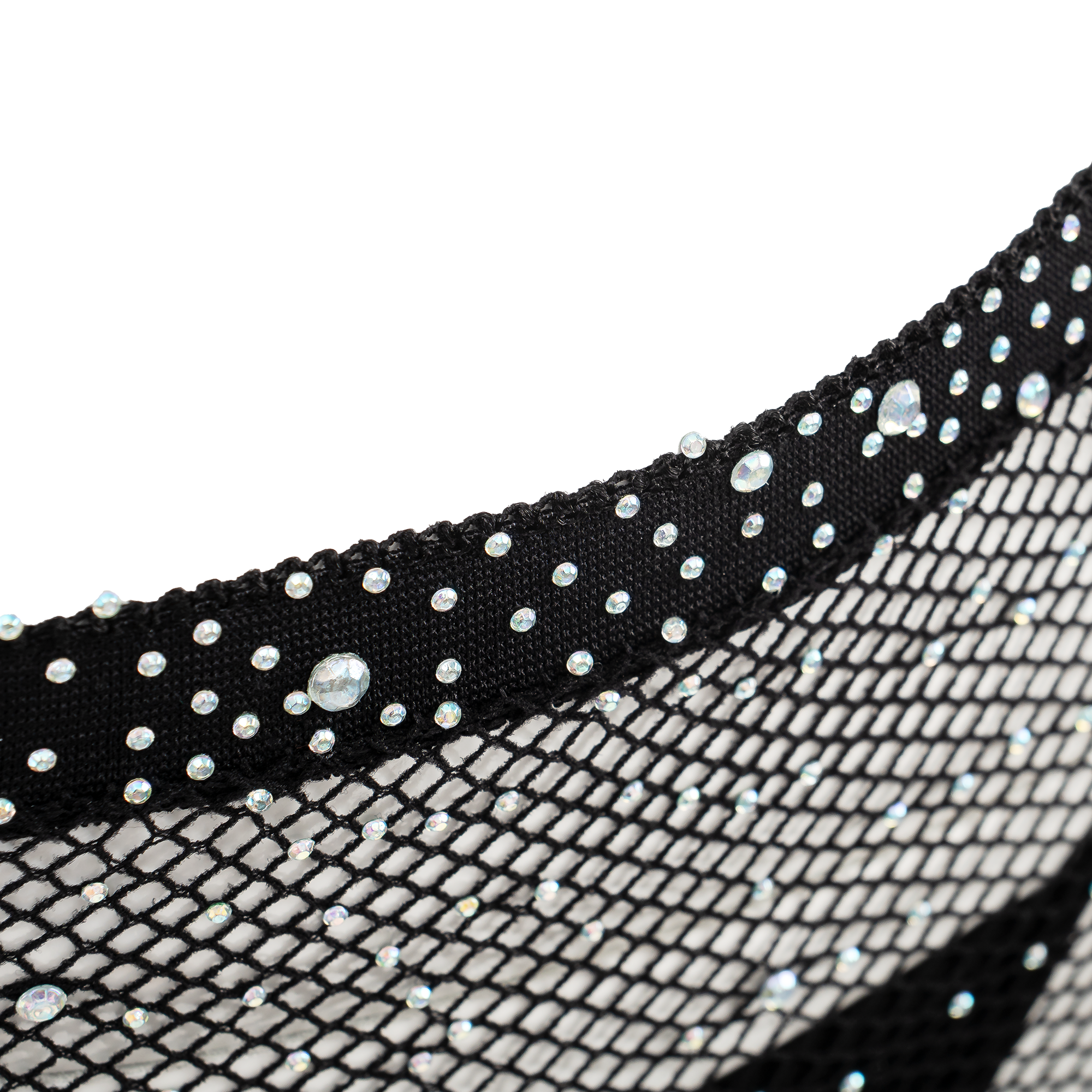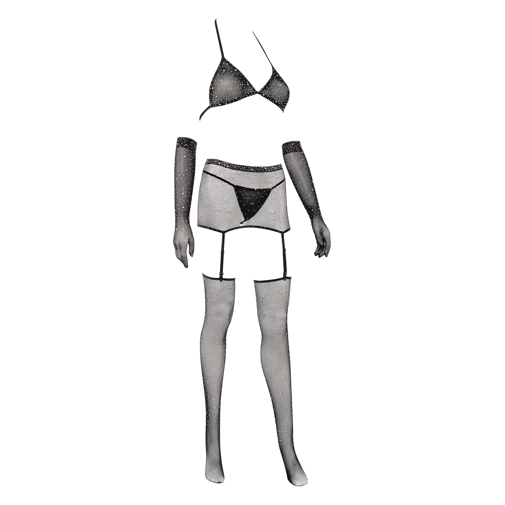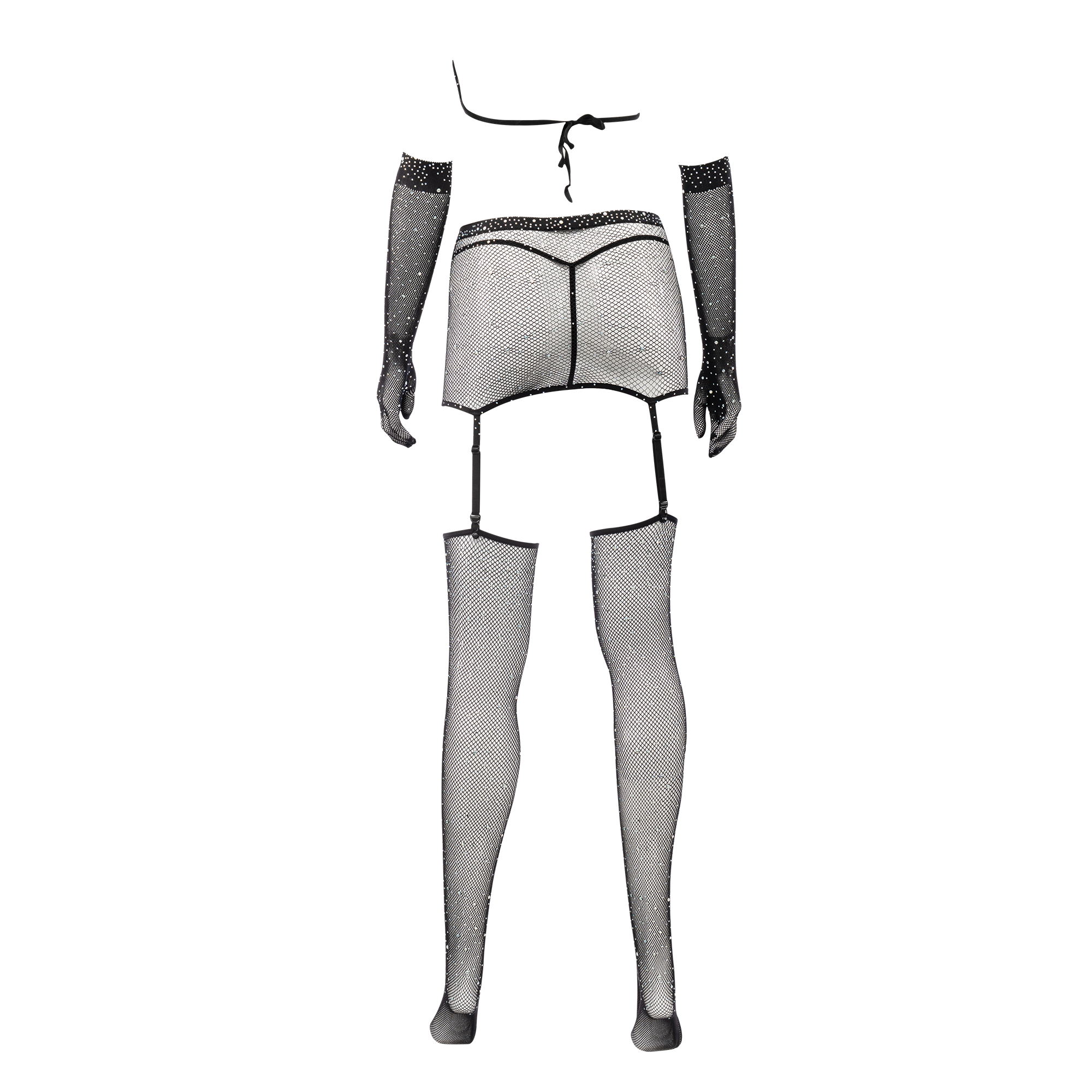 Este conjunto de 7 piezas está confeccionado en suave y elástica tela de rejilla y está completamente decorado con pedrería.