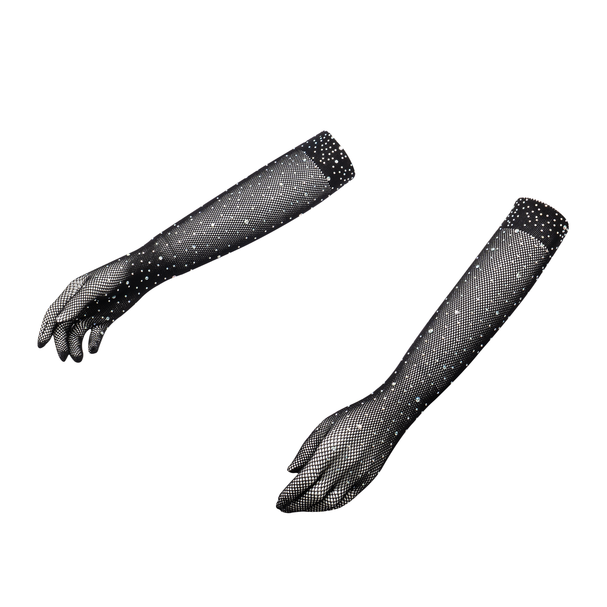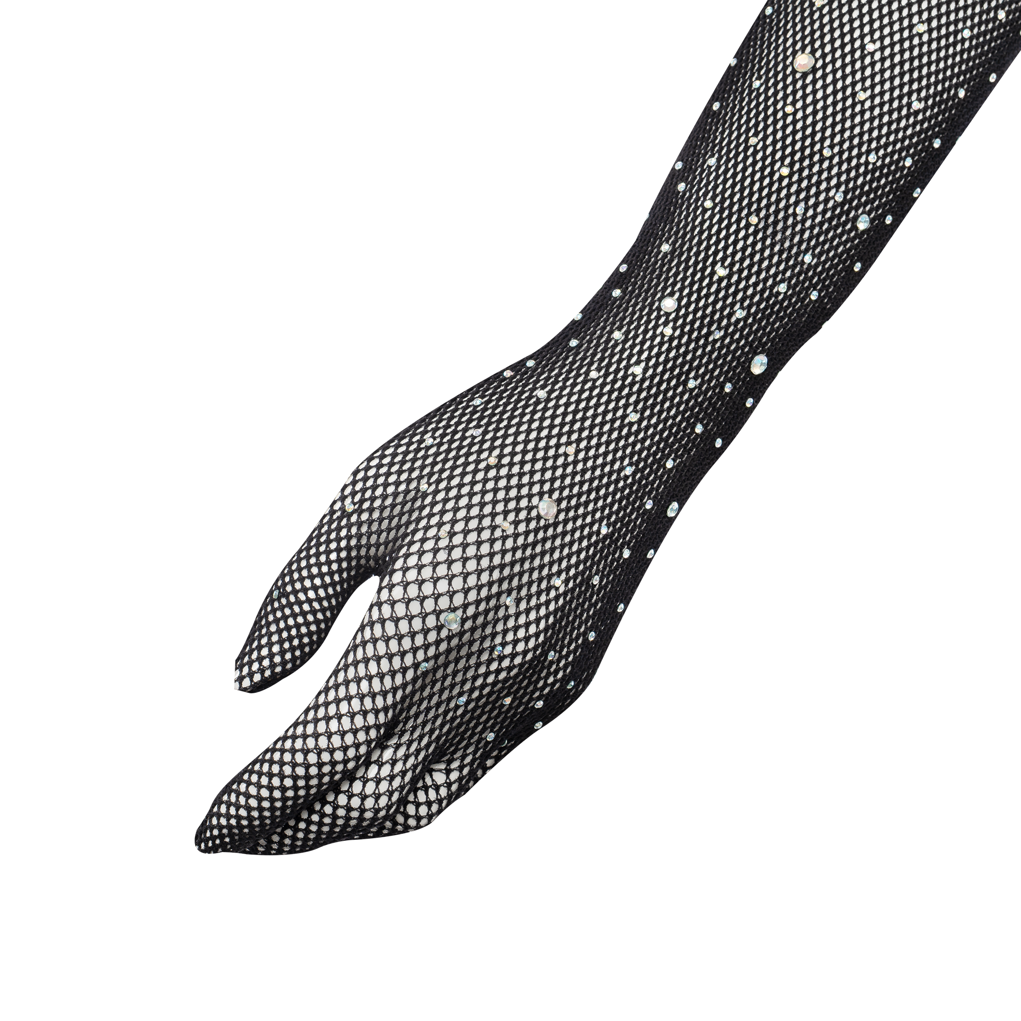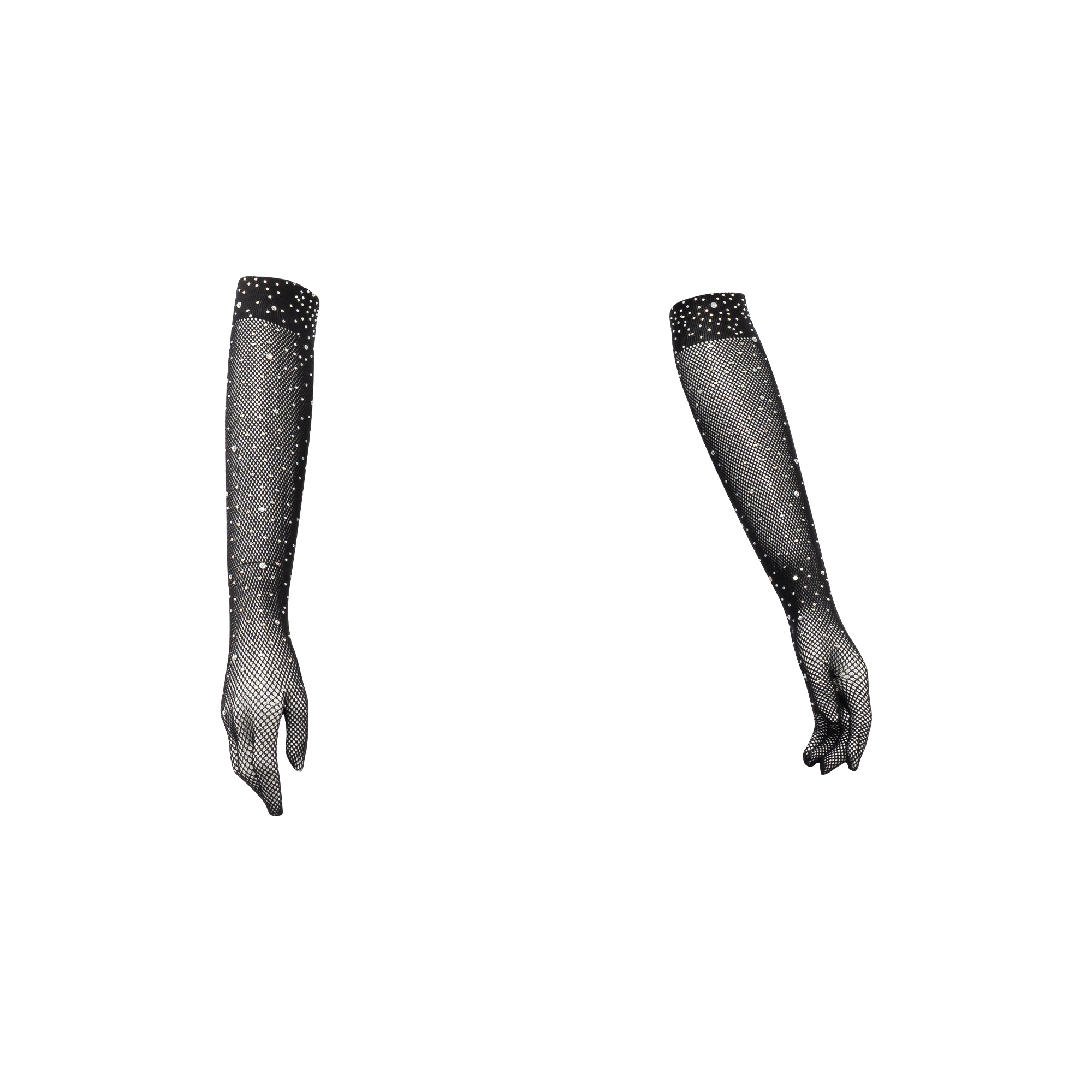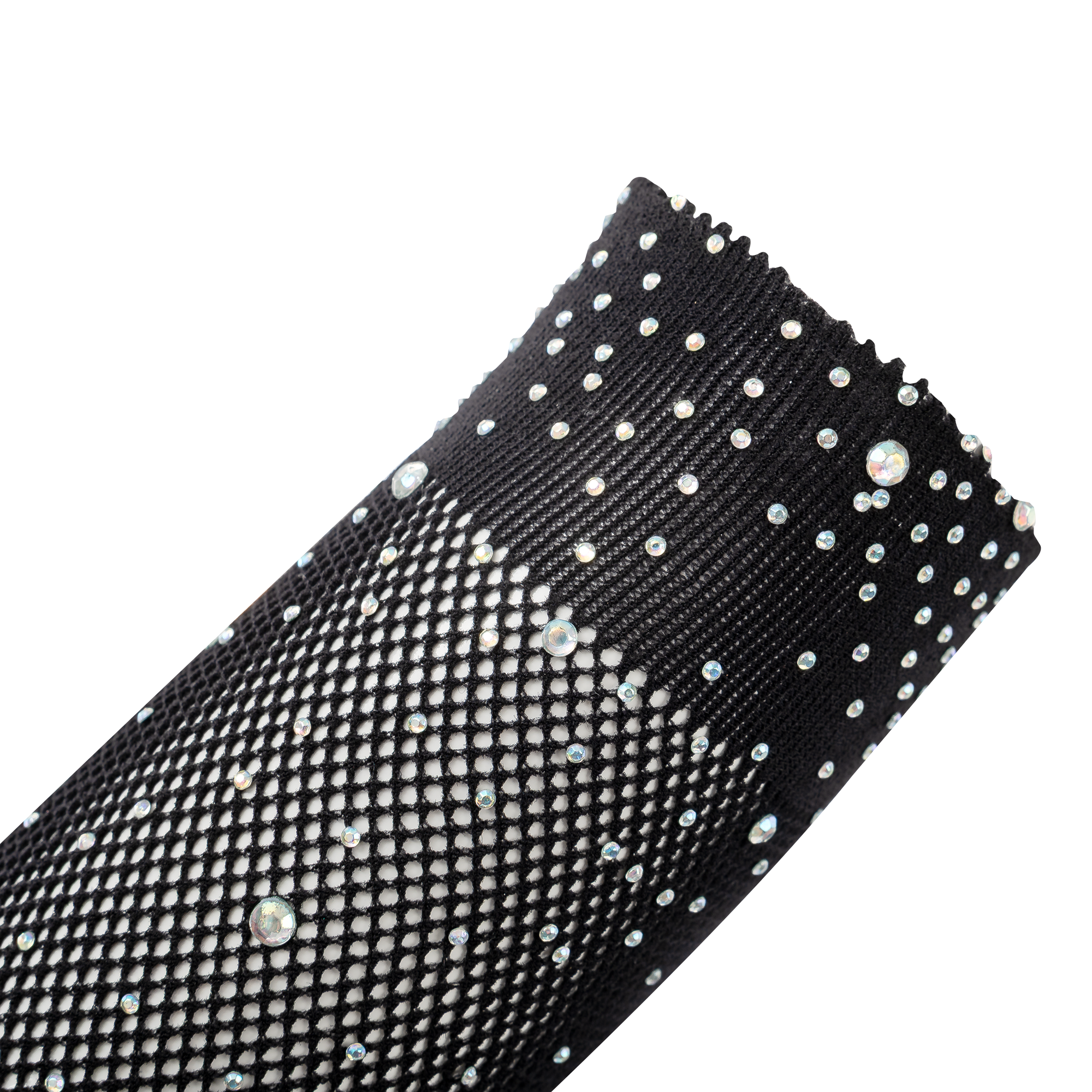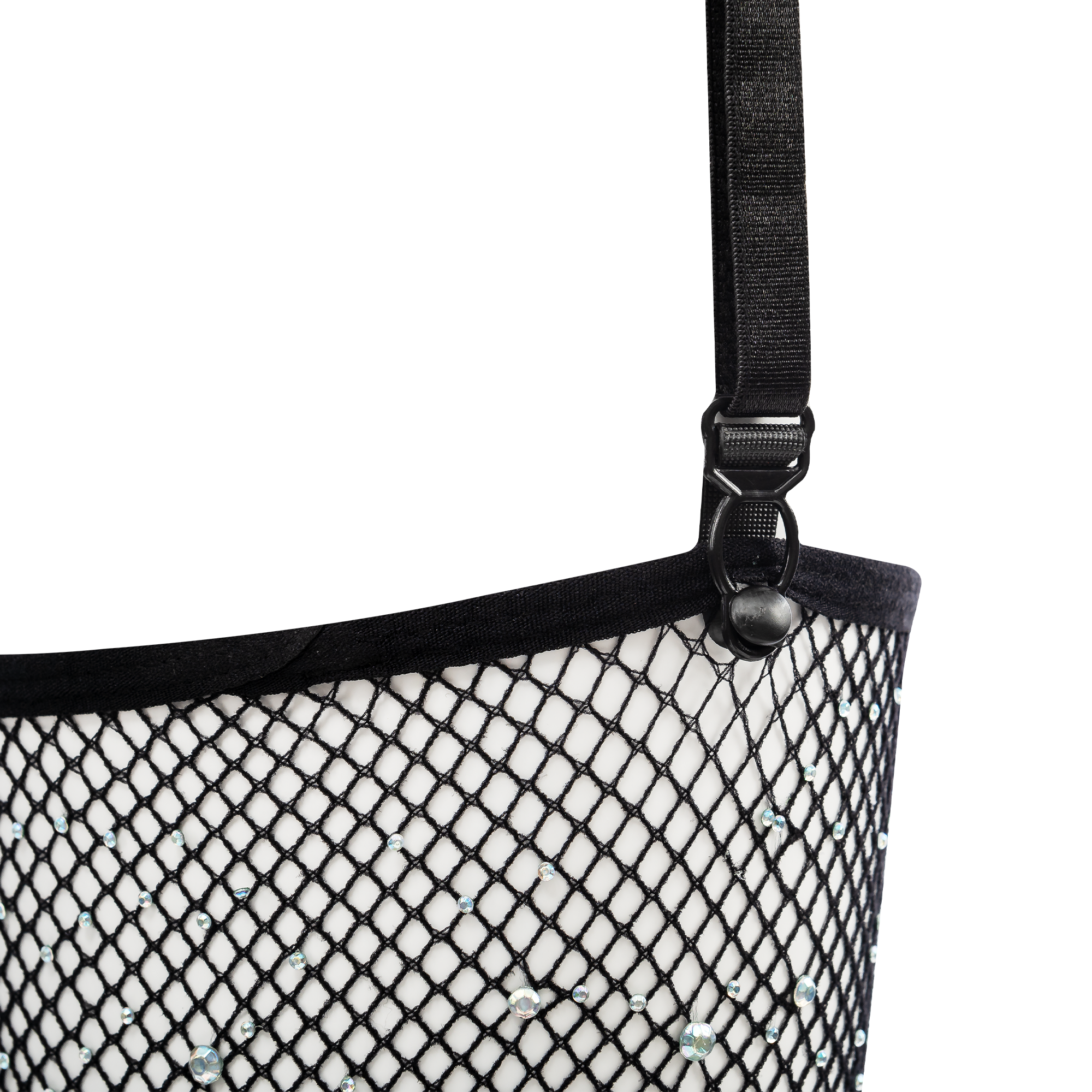 Este conjunto de 7 piezas está confeccionado en suave y elástica tela de rejilla y está completamente decorado con pedrería.