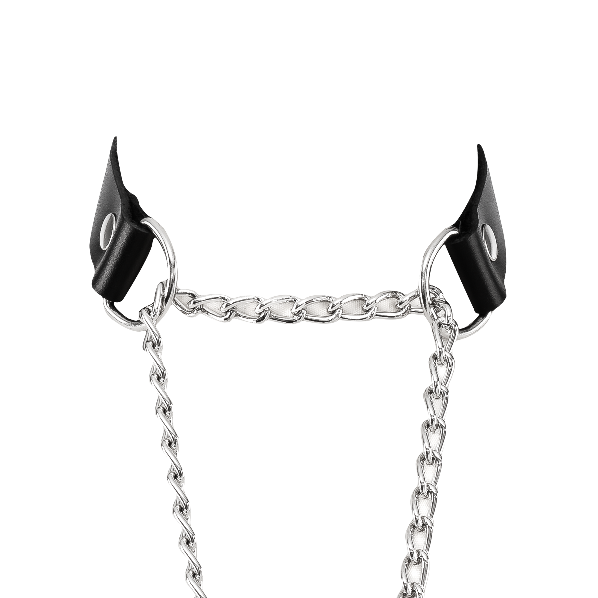 Este collar está hecho a mano con cuero genuino de silla de montar e incluye una cadena de metal.
