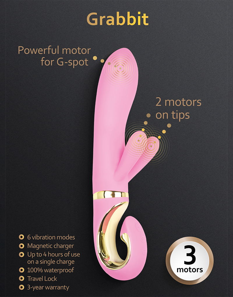 Kann von 3 starken Motoren rühmen, einer von denen sich im Stamm an der Spitze befindet, um Punkt G zu stimulieren. Und zwei Motoren in kleinen Ohren, um die Klitoris zu stimulieren. Betriebszeit Grabbit – nicht weniger als 4 Stunden mit einer Ladung.