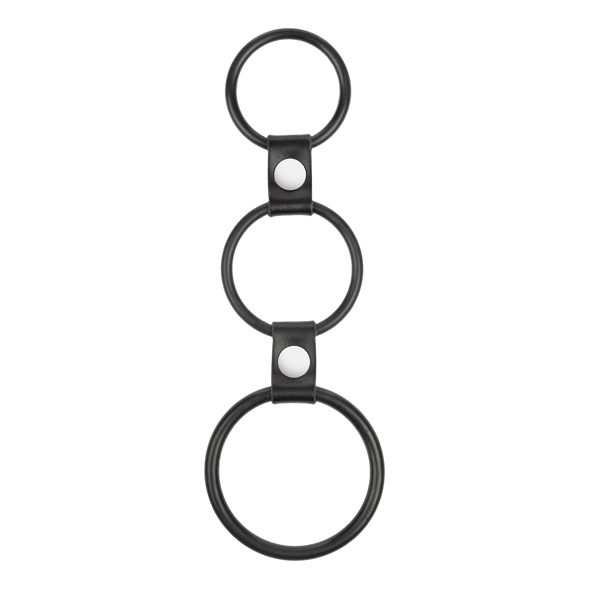 The rings have 3 different sizes: 35 mm, 40 mm & 50 mm. Wear the largest ring behind the penis, the middle ring around the scrotum and the smallest ring around the penis.