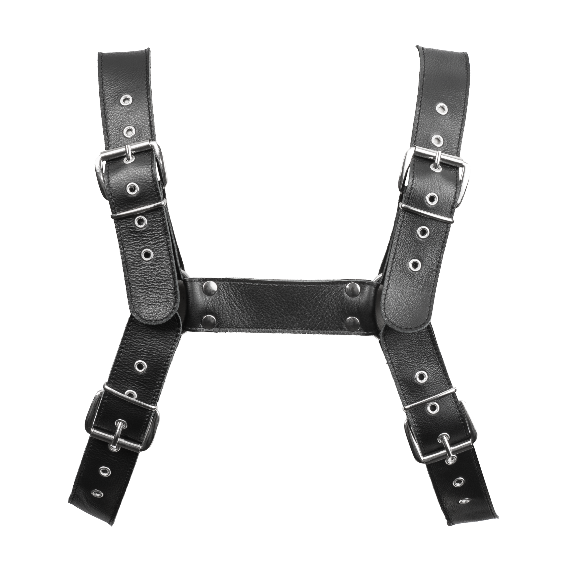 Este arnés de pecho de cuero está hecho a mano con lujosa piel napa y tiene un interior de gamuza suave.