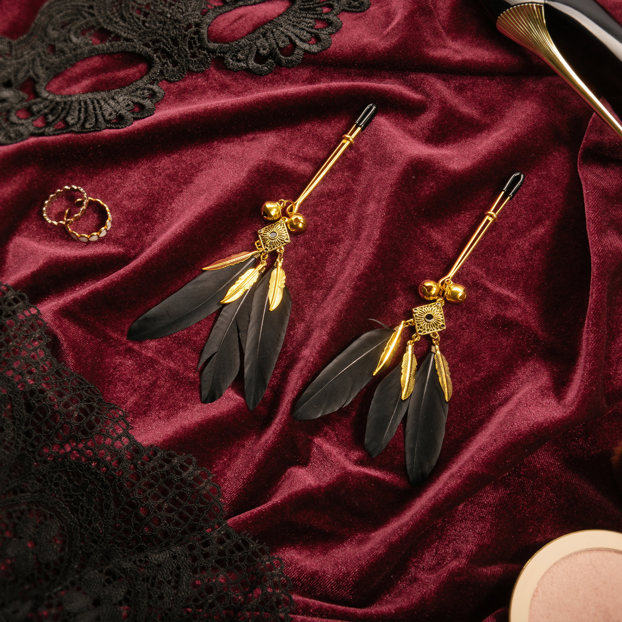 Rimba Bondage Play - Pinces à tétons avec plumes - Noir et or