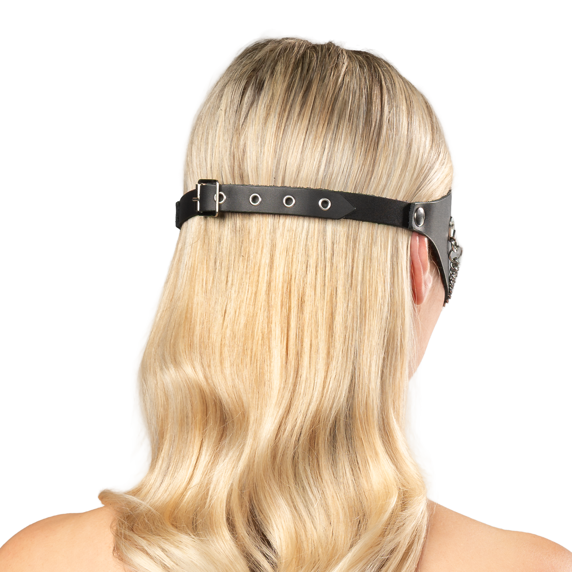 Dit masker is handgemaakt van echt tuigleder en is aan de voorkant versierd met kettingen.