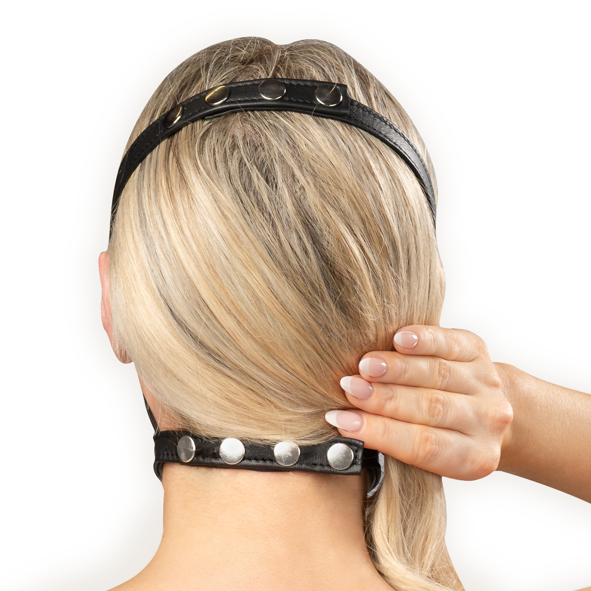 Hij wordt vastgemaakt doormiddel van een band in de nek en een band om het hoofd.