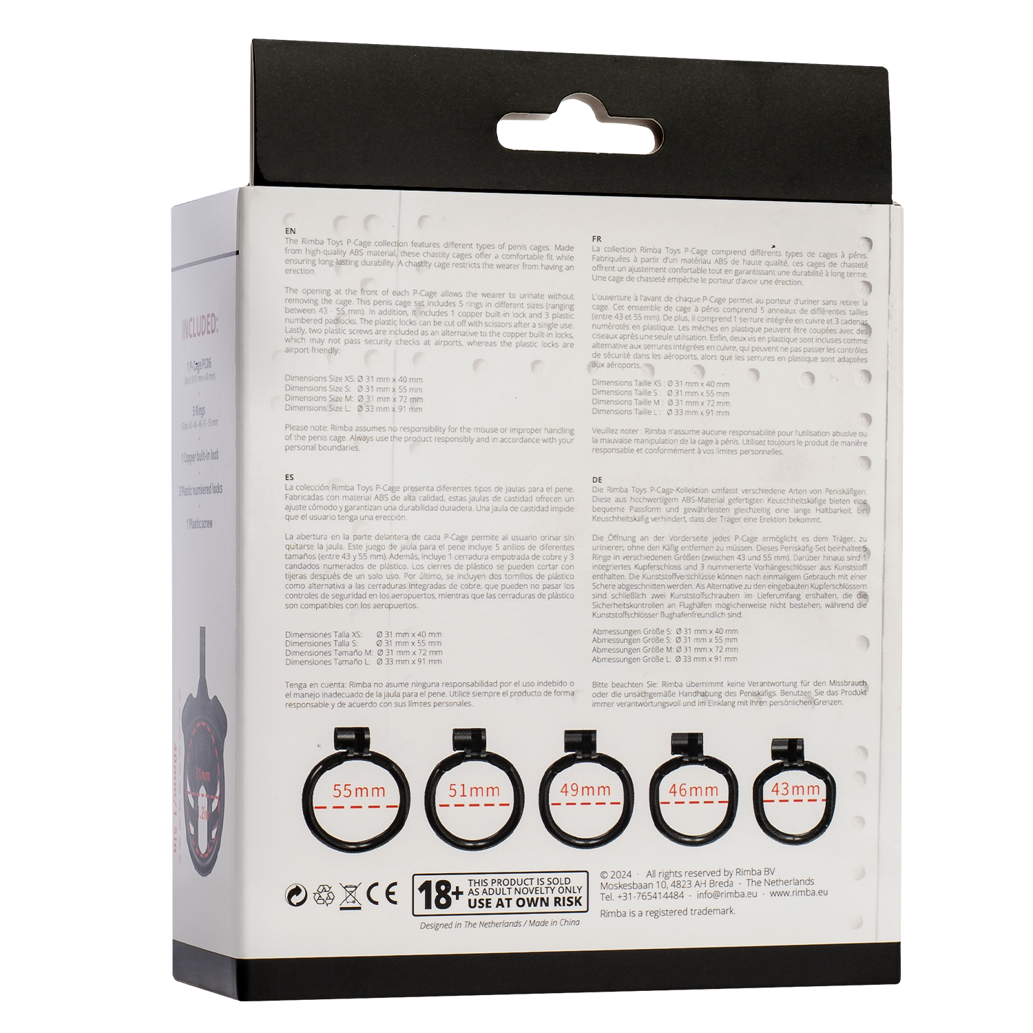 Die Rimba P-Cage Kollektion umfasst verschiedene Arten von Peniskäfigen. Aus hochwertigem ABS-Material gefertigt, bieten diese Keuschheitskäfige eine bequeme Passform und gewährleisten eine lange Haltbarkeit. Ein Keuschheitskäfig hindert den Träger daran, eine Erektion zu bekommen. Die Öffnung an der Vorderseite jedes P-Käfigs ermöglicht es dem Träger, zu urinieren, ohne den Käfig zu entfernen. Dieses Peniskäfig-Set enthält 5 Ringe in verschiedenen Größen (zwischen 43 und 55 mm). Außerdem enthält es 1 eingebautes Kupferschloss und 3 nummerierte Vorhängeschlösser aus Kunststoff. Die Plastikschlösser können nach einmaligem Gebrauch mit einer Schere abgeschnitten werden. Schließlich ist eine Kunststoffschraube als Alternative zum eingebauten Kupferschloss enthalten, das möglicherweise nicht durch die Sicherheitskontrollen am Flughafen passt, während das Kunststoffschloss flughafenfreundlich ist.