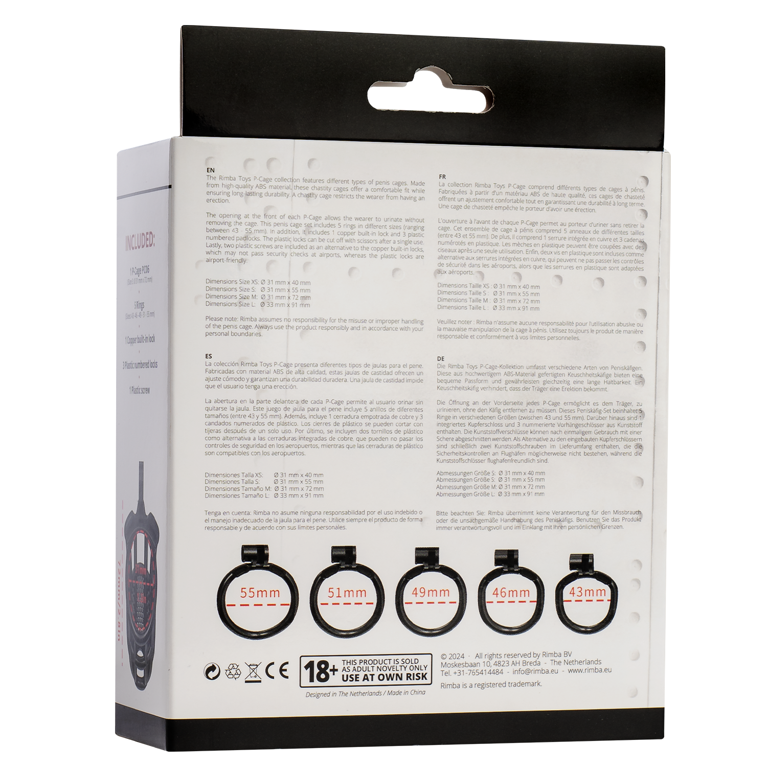 Die Rimba P-Cage Kollektion umfasst verschiedene Arten von Peniskäfigen. Aus hochwertigem ABS-Material gefertigt, bieten diese Keuschheitskäfige eine bequeme Passform und gewährleisten eine lange Haltbarkeit. Ein Keuschheitskäfig hindert den Träger daran, eine Erektion zu bekommen. Die Öffnung an der Vorderseite jedes P-Käfigs ermöglicht es dem Träger, zu urinieren, ohne den Käfig zu entfernen. Dieses Peniskäfig-Set enthält 5 Ringe in verschiedenen Größen (zwischen 43 und 55 mm). Außerdem enthält es 1 eingebautes Kupferschloss und 3 nummerierte Vorhängeschlösser aus Kunststoff. Die Plastikschlösser können nach einmaligem Gebrauch mit einer Schere abgeschnitten werden. Schließlich ist eine Kunststoffschraube als Alternative zum eingebauten Kupferschloss enthalten, das möglicherweise nicht durch die Sicherheitskontrollen am Flughafen passt, während das Kunststoffschloss flughafenfreundlich ist.