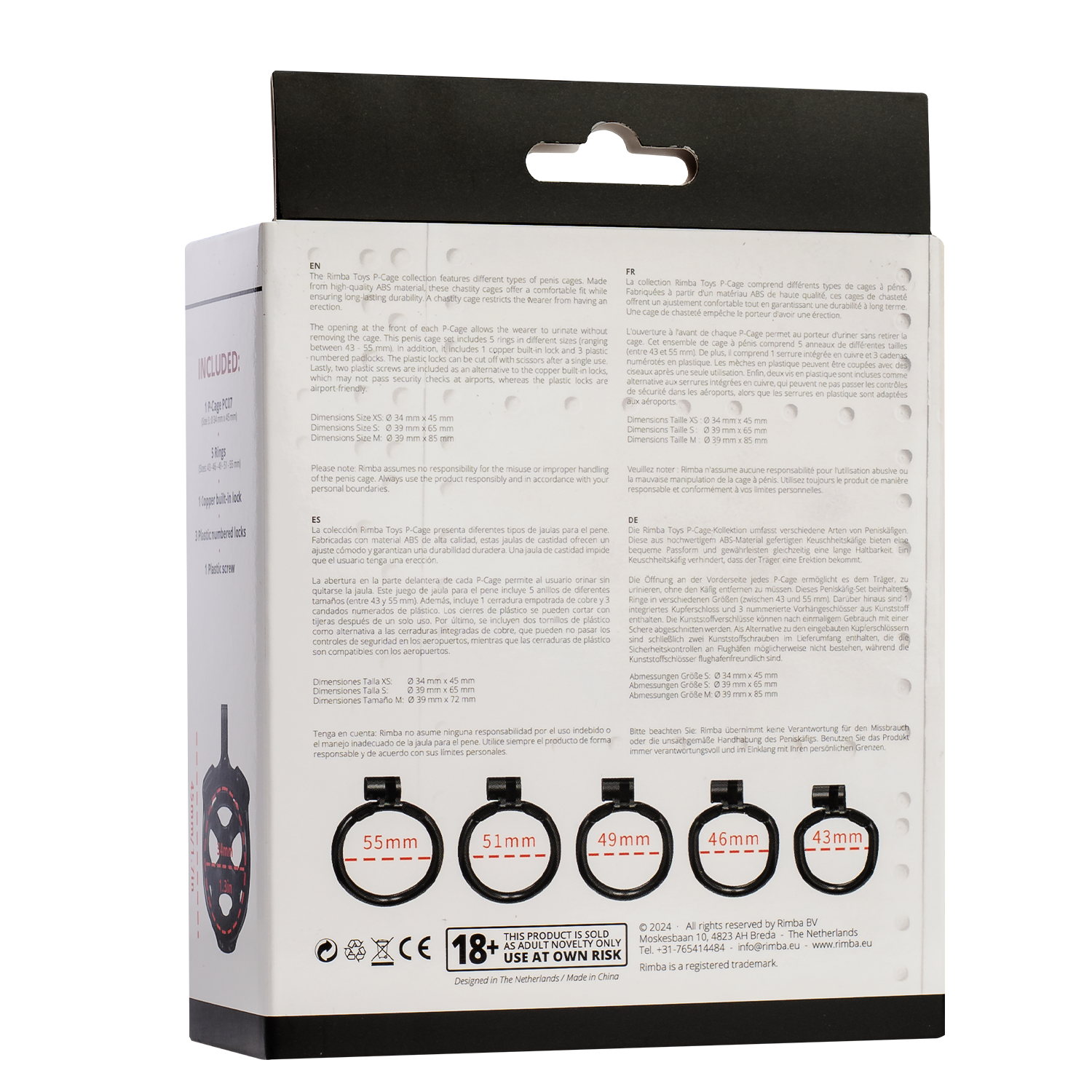 Die Rimba P-Cage Kollektion umfasst verschiedene Arten von Peniskäfigen. Aus hochwertigem ABS-Material gefertigt, bieten diese Keuschheitskäfige eine bequeme Passform und gewährleisten eine lange Haltbarkeit. Ein Keuschheitskäfig hindert den Träger daran, eine Erektion zu bekommen. Die Öffnung an der Vorderseite jedes P-Käfigs ermöglicht es dem Träger, zu urinieren, ohne den Käfig zu entfernen. Dieses Peniskäfig-Set enthält 5 Ringe in verschiedenen Größen (zwischen 43 und 55 mm). Außerdem enthält es 1 eingebautes Kupferschloss und 3 nummerierte Vorhängeschlösser aus Kunststoff. Die Plastikschlösser können nach einmaligem Gebrauch mit einer Schere abgeschnitten werden. Schließlich ist eine Kunststoffschraube als Alternative zum eingebauten Kupferschloss enthalten, das möglicherweise nicht durch die Sicherheitskontrollen am Flughafen passt, während das Kunststoffschloss flughafenfreundlich ist.