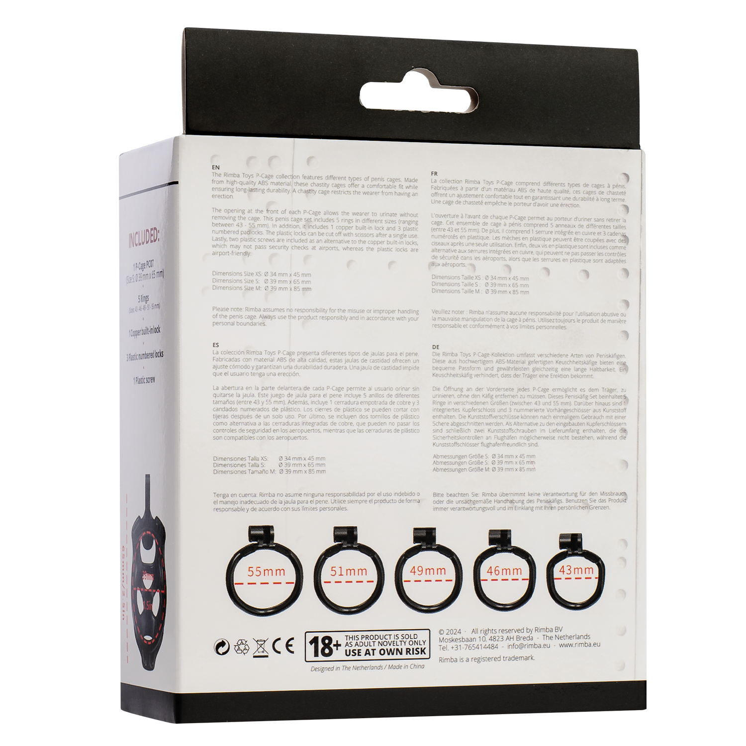 Die Rimba P-Cage Kollektion umfasst verschiedene Arten von Peniskäfigen. Aus hochwertigem ABS-Material gefertigt, bieten diese Keuschheitskäfige eine bequeme Passform und gewährleisten eine lange Haltbarkeit. Ein Keuschheitskäfig hindert den Träger daran, eine Erektion zu bekommen. Die Öffnung an der Vorderseite jedes P-Käfigs ermöglicht es dem Träger, zu urinieren, ohne den Käfig zu entfernen. Dieses Peniskäfig-Set enthält 5 Ringe in verschiedenen Größen (zwischen 43 und 55 mm). Außerdem enthält es 1 eingebautes Kupferschloss und 3 nummerierte Vorhängeschlösser aus Kunststoff. Die Plastikschlösser können nach einmaligem Gebrauch mit einer Schere abgeschnitten werden. Schließlich ist eine Kunststoffschraube als Alternative zum eingebauten Kupferschloss enthalten, das möglicherweise nicht durch die Sicherheitskontrollen am Flughafen passt, während das Kunststoffschloss flughafenfreundlich ist.