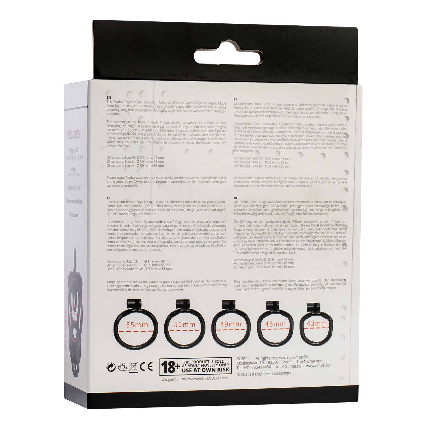 Die Rimba P-Cage Kollektion umfasst verschiedene Arten von Peniskäfigen. Aus hochwertigem ABS-Material gefertigt, bieten diese Keuschheitskäfige eine bequeme Passform und gewährleisten eine lange Haltbarkeit. Ein Keuschheitskäfig hindert den Träger daran, eine Erektion zu bekommen. Die Öffnung an der Vorderseite jedes P-Käfigs ermöglicht es dem Träger, zu urinieren, ohne den Käfig zu entfernen. Dieses Peniskäfig-Set enthält 5 Ringe in verschiedenen Größen (zwischen 43 und 55 mm). Außerdem enthält es 1 eingebautes Kupferschloss und 3 nummerierte Vorhängeschlösser aus Kunststoff. Die Plastikschlösser können nach einmaligem Gebrauch mit einer Schere abgeschnitten werden. Schließlich ist eine Kunststoffschraube als Alternative zum eingebauten Kupferschloss enthalten, das möglicherweise nicht durch die Sicherheitskontrollen am Flughafen passt, während das Kunststoffschloss flughafenfreundlich ist.