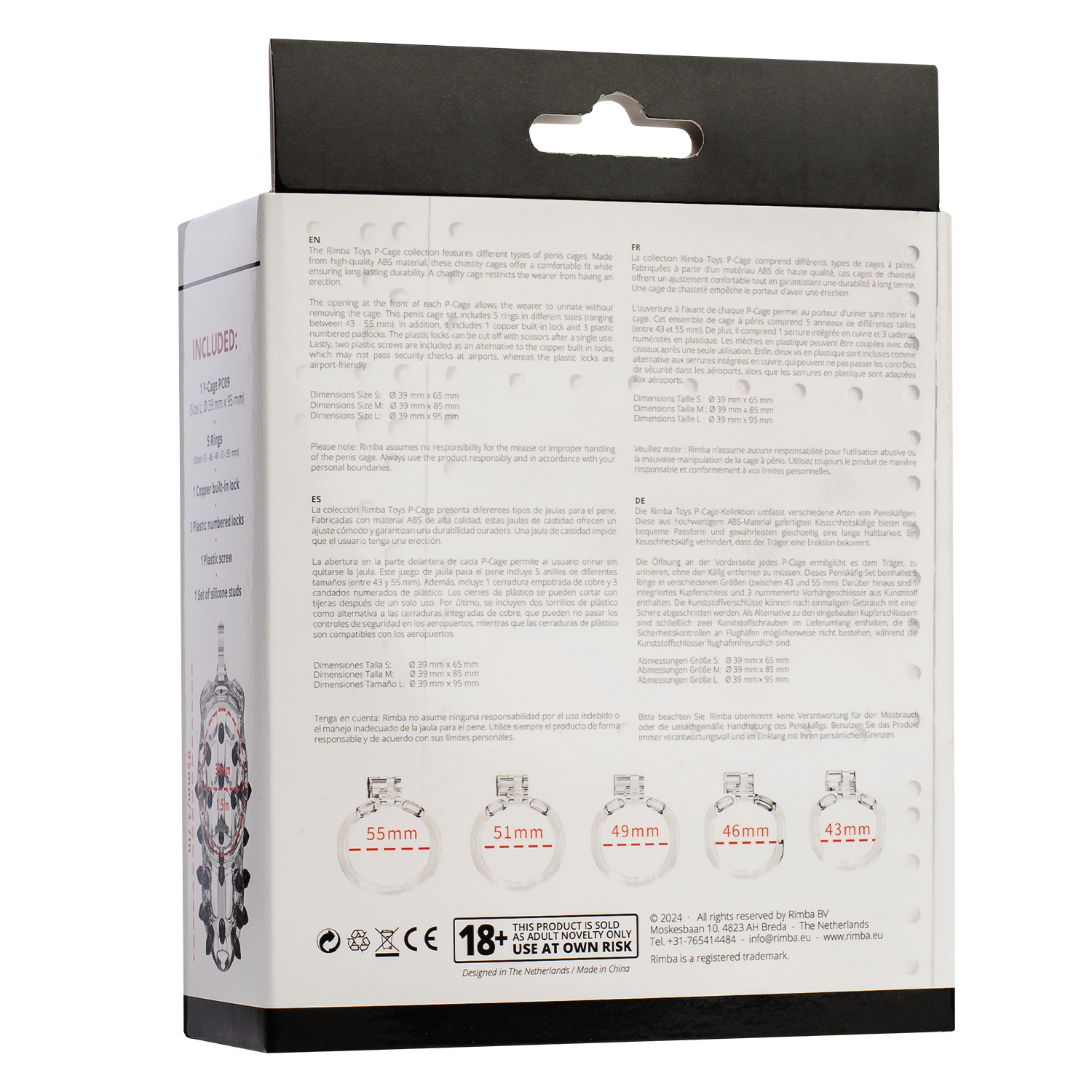 Die Rimba P-Cage Kollektion umfasst verschiedene Arten von Peniskäfigen. Aus hochwertigem ABS-Material gefertigt, bieten diese Keuschheitskäfige einen bequemen Sitz und gewährleisten eine lange Haltbarkeit. Ein Keuschheitskäfig hindert den Träger daran, eine Erektion zu bekommen. Die Öffnung an der Vorderseite jedes P-Käfigs ermöglicht es dem Träger, zu urinieren, ohne den Käfig zu entfernen. Dieses Peniskäfig-Set enthält 5 Ringe in verschiedenen Größen (zwischen 43 und 55 mm). Außerdem enthält es 1 eingebautes Kupferschloss und 3 nummerierte Vorhängeschlösser aus Kunststoff. Die Plastikschlösser können nach einmaligem Gebrauch mit einer Schere abgeschnitten werden. Schließlich ist eine Kunststoffschraube als Alternative zum eingebauten Kupferschloss enthalten, das möglicherweise nicht durch die Sicherheitskontrollen am Flughafen passt, während das Kunststoffschloss flughafenfreundlich ist.