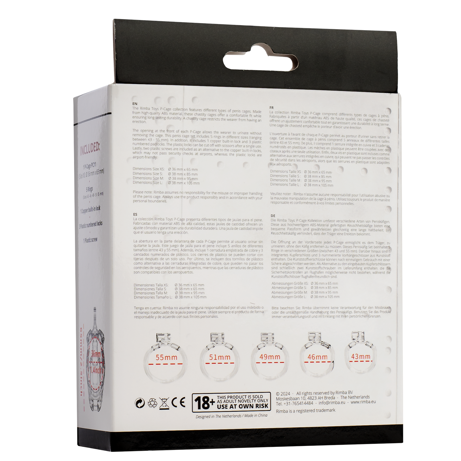 Die Rimba P-Cage Kollektion umfasst verschiedene Arten von Peniskäfigen. Aus hochwertigem ABS-Material gefertigt, bieten diese Keuschheitskäfige einen bequemen Sitz und gewährleisten eine lange Haltbarkeit. Ein Keuschheitskäfig hindert den Träger daran, eine Erektion zu haben. Die Öffnung an der Vorderseite jedes P-Käfigs ermöglicht es dem Träger, zu urinieren, ohne den Käfig zu entfernen. Dieses Peniskäfig-Set enthält 5 Ringe in verschiedenen Größen (zwischen 43 und 55 mm). Außerdem enthält es 1 eingebautes Kupferschloss und 3 nummerierte Vorhängeschlösser aus Kunststoff. Die Plastikschlösser können nach einmaligem Gebrauch mit einer Schere abgeschnitten werden. Schließlich ist eine Kunststoffschraube als Alternative zum eingebauten Kupferschloss enthalten, das möglicherweise nicht durch die Sicherheitskontrollen am Flughafen passt, während das Kunststoffschloss flughafenfreundlich ist.