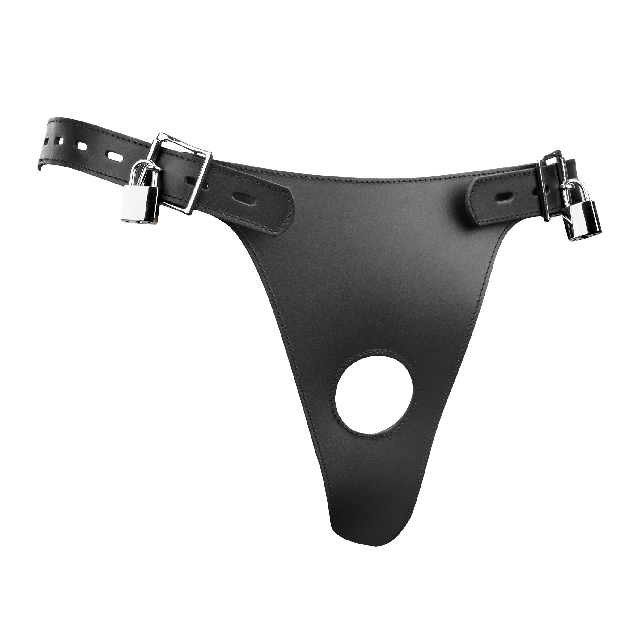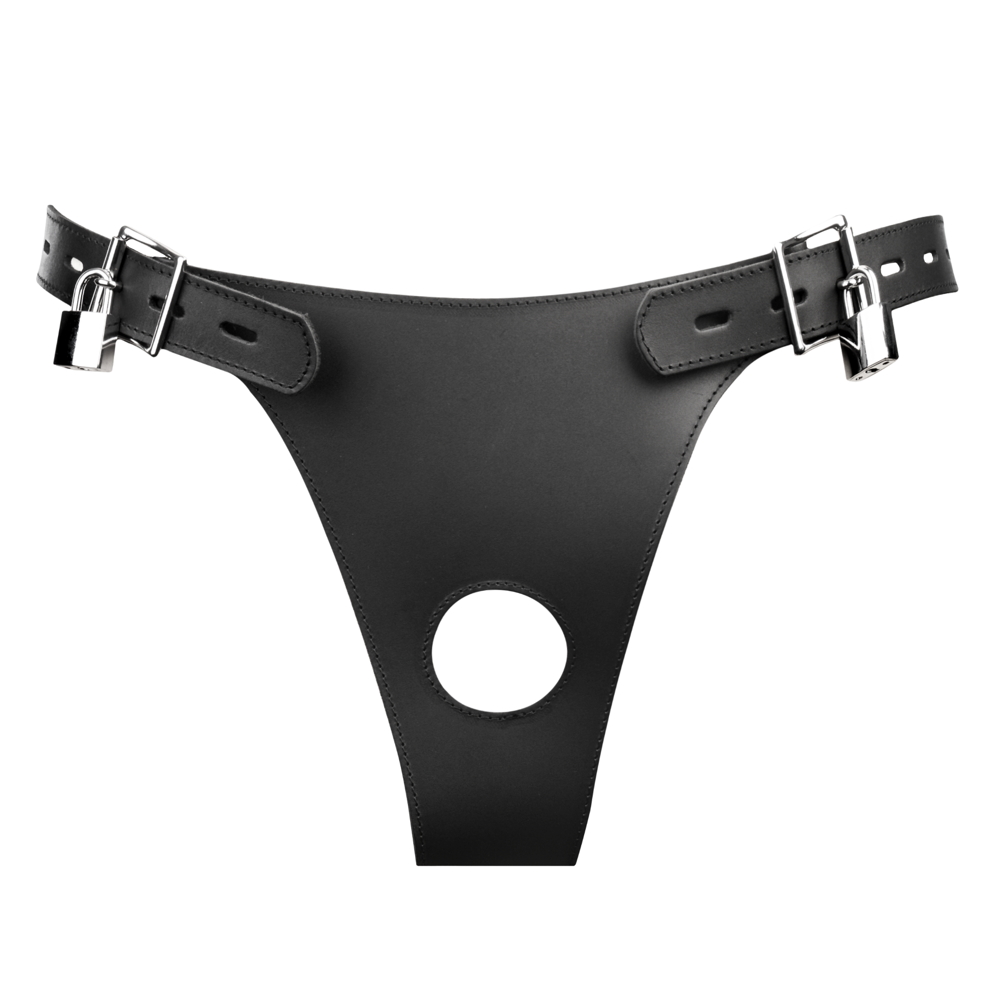 Leder-Keuschheitsgürtel mit Vorhängeschlössern und aufblasbarem Analplug.
