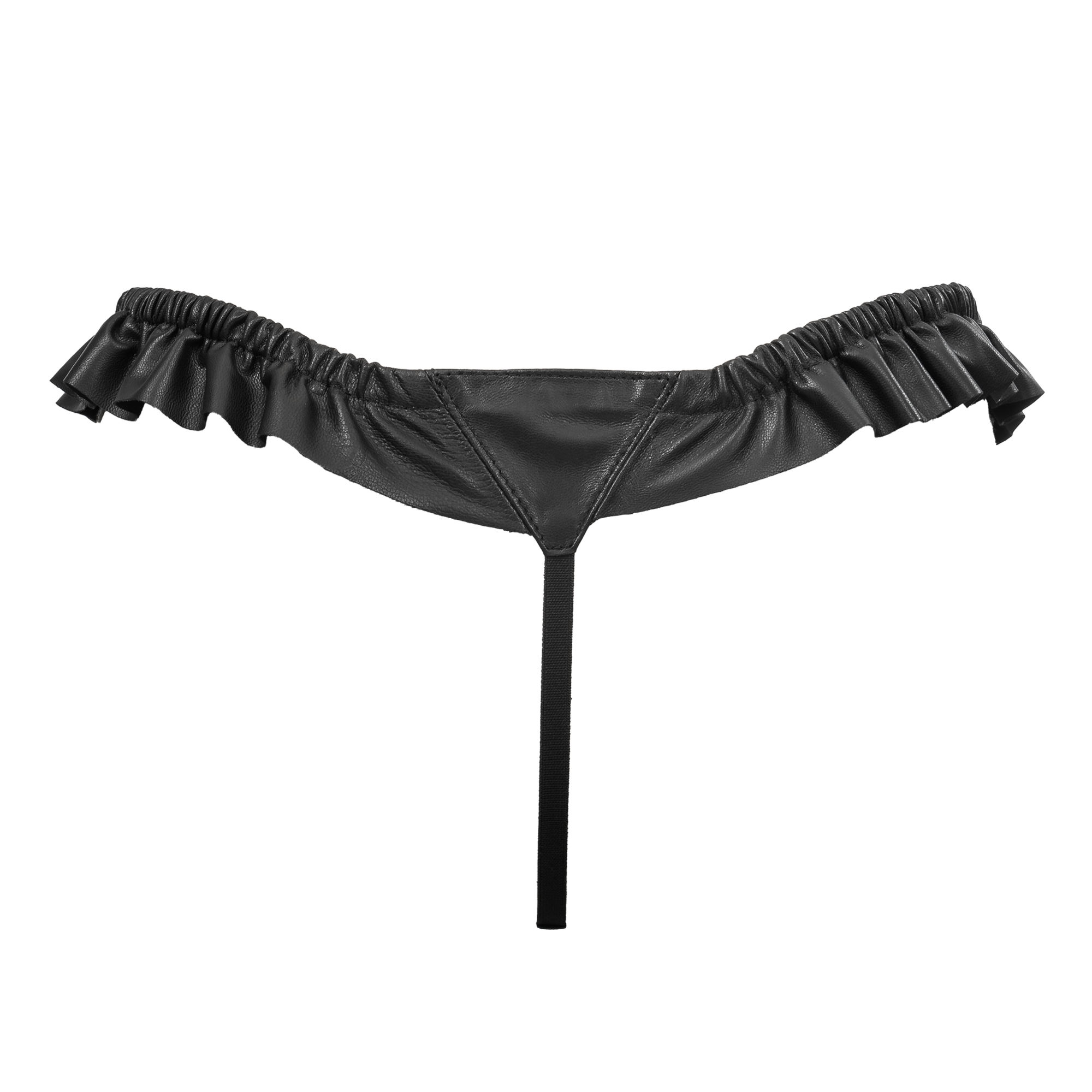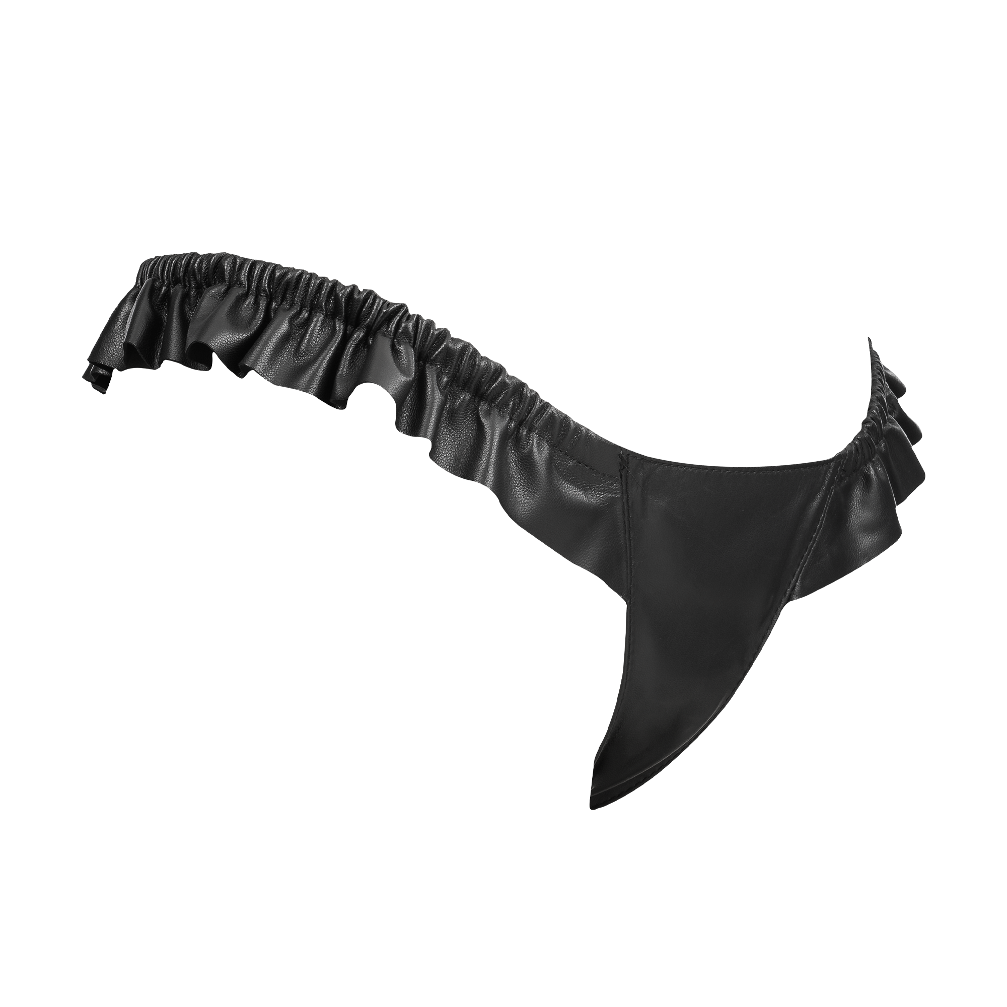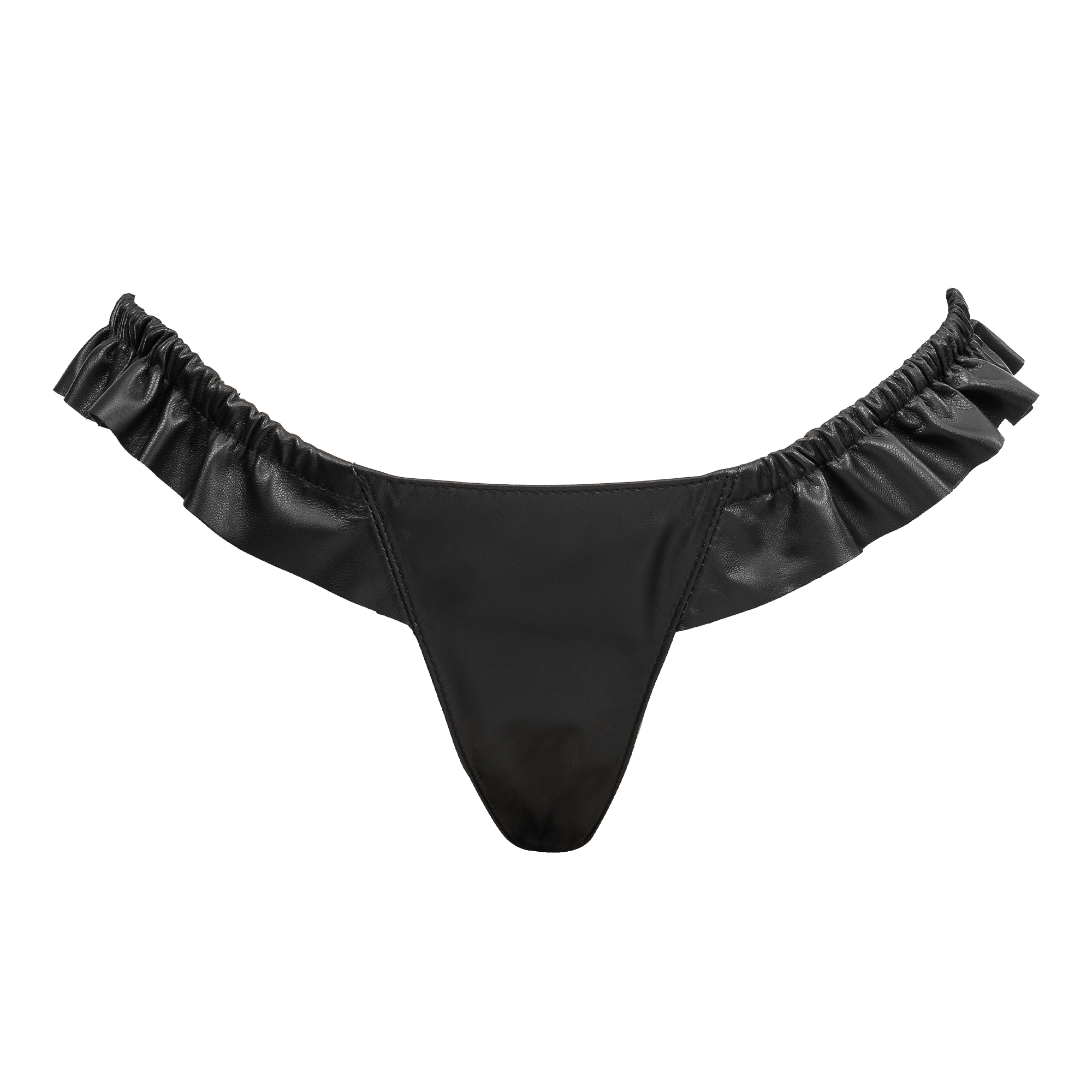 Rimba Bondage Play – Luxus-Leder-String mit Rüschen – Schwarz
