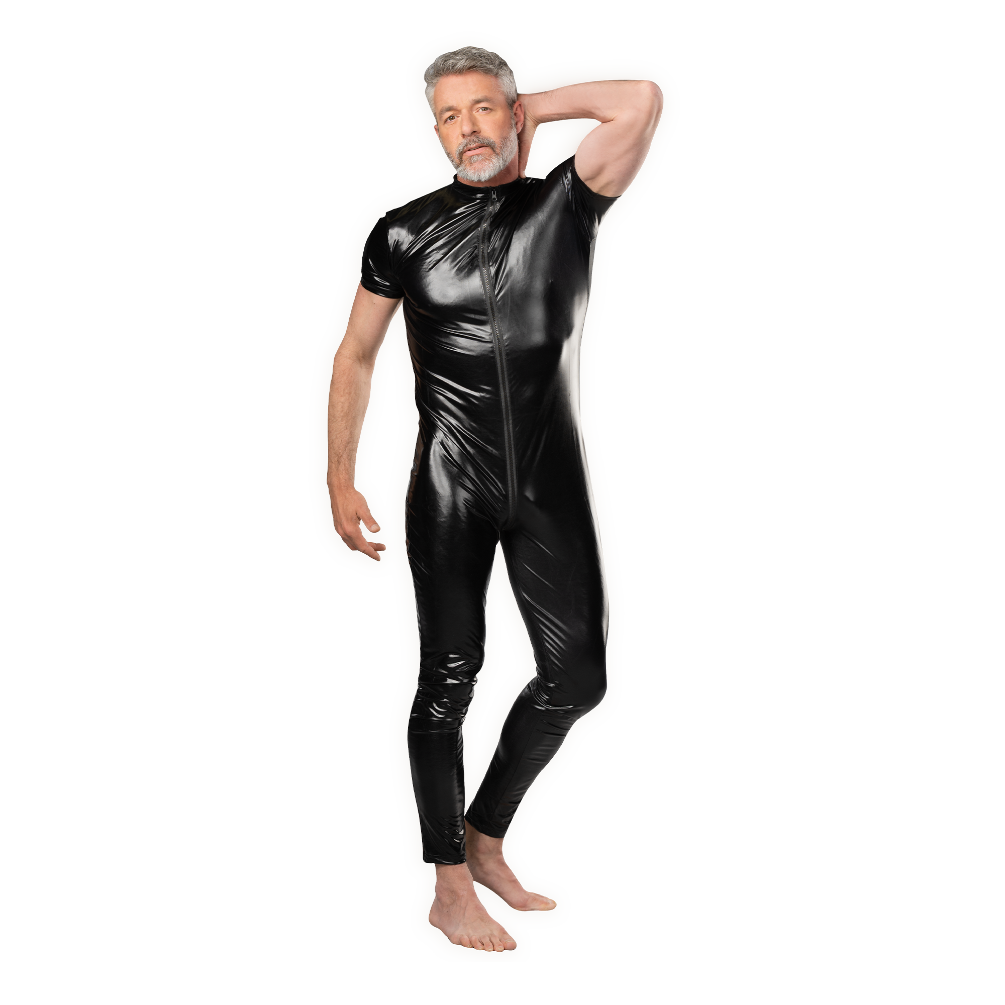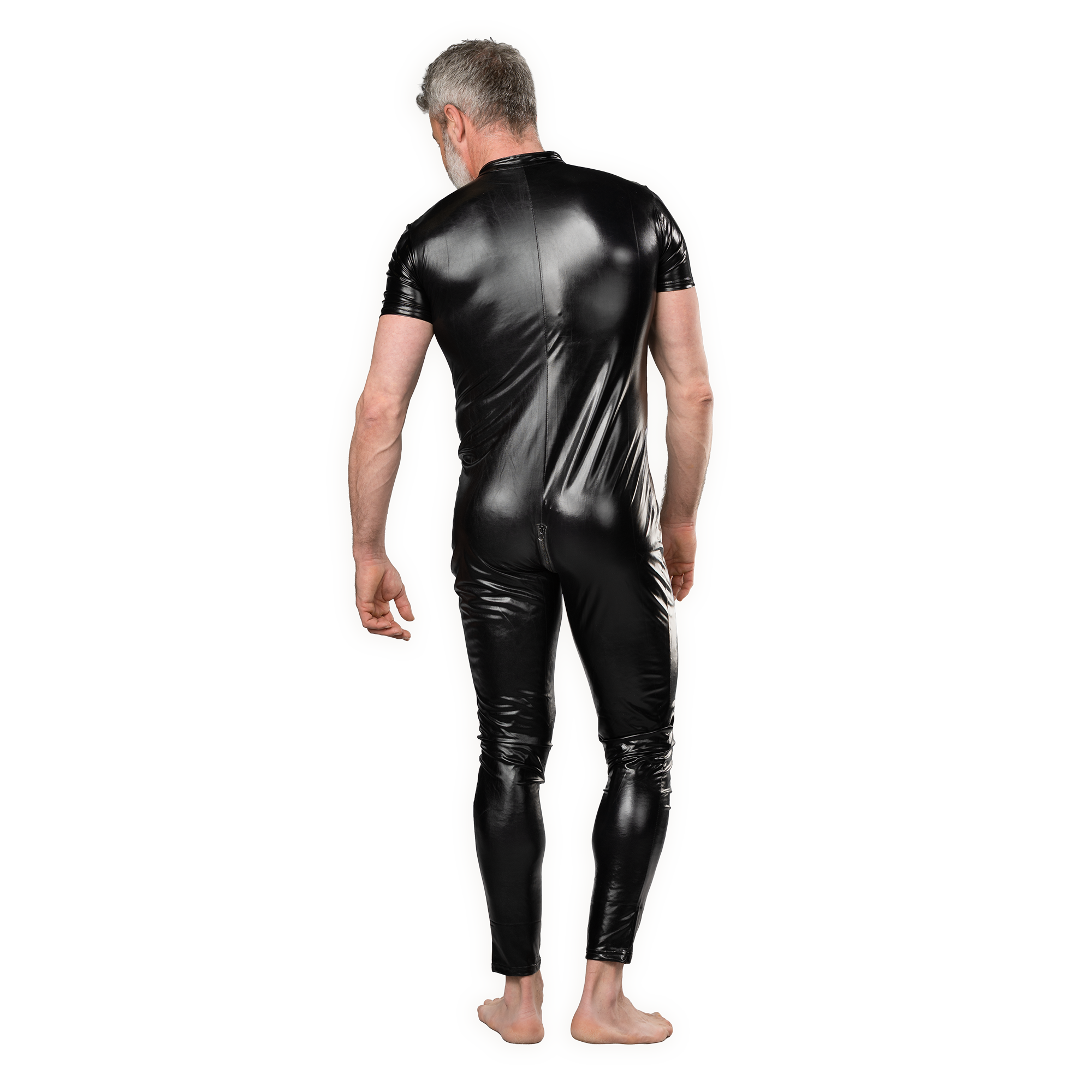 This jumpsuit is made of stretchy wetlook material and has a long zip from the neck to the buttocks.