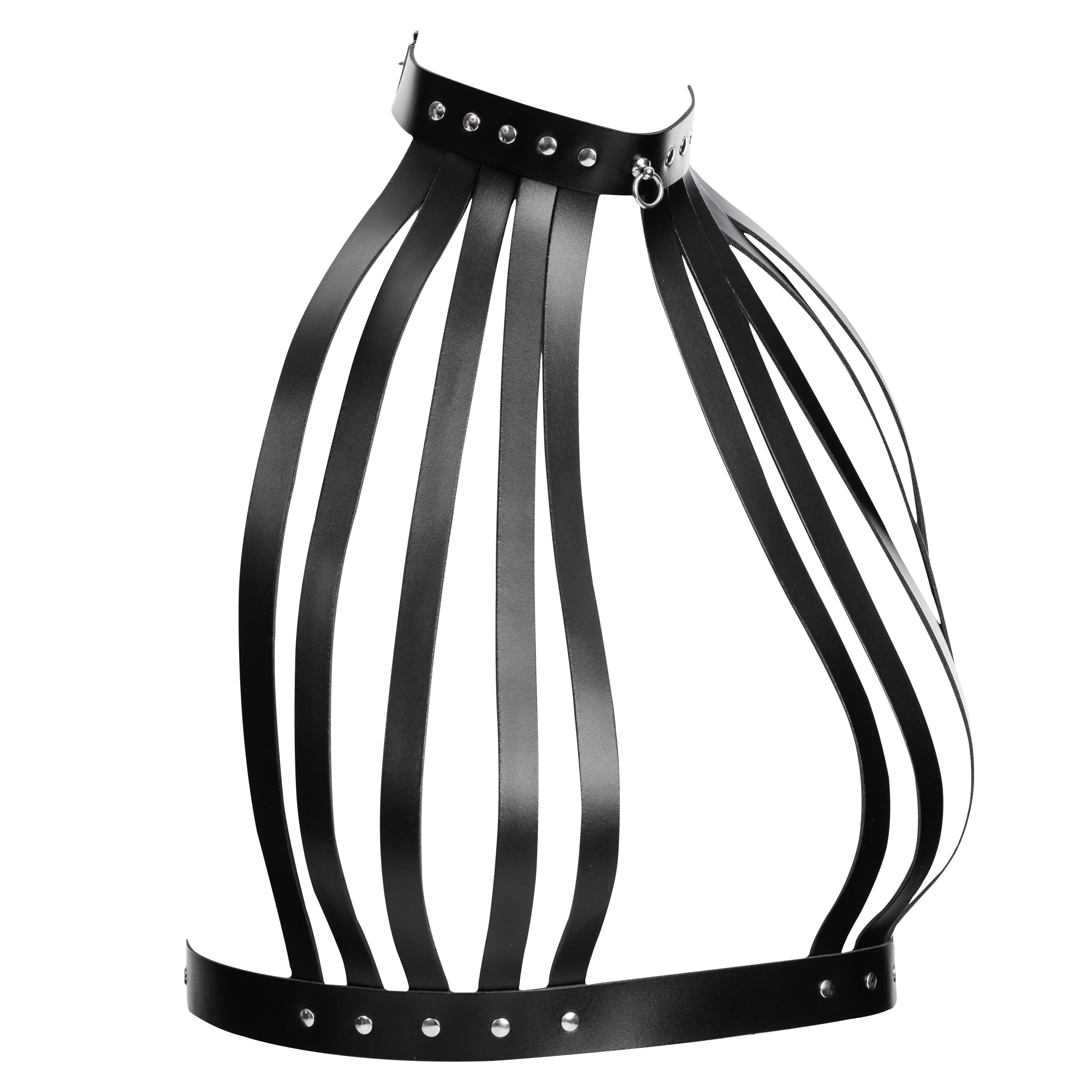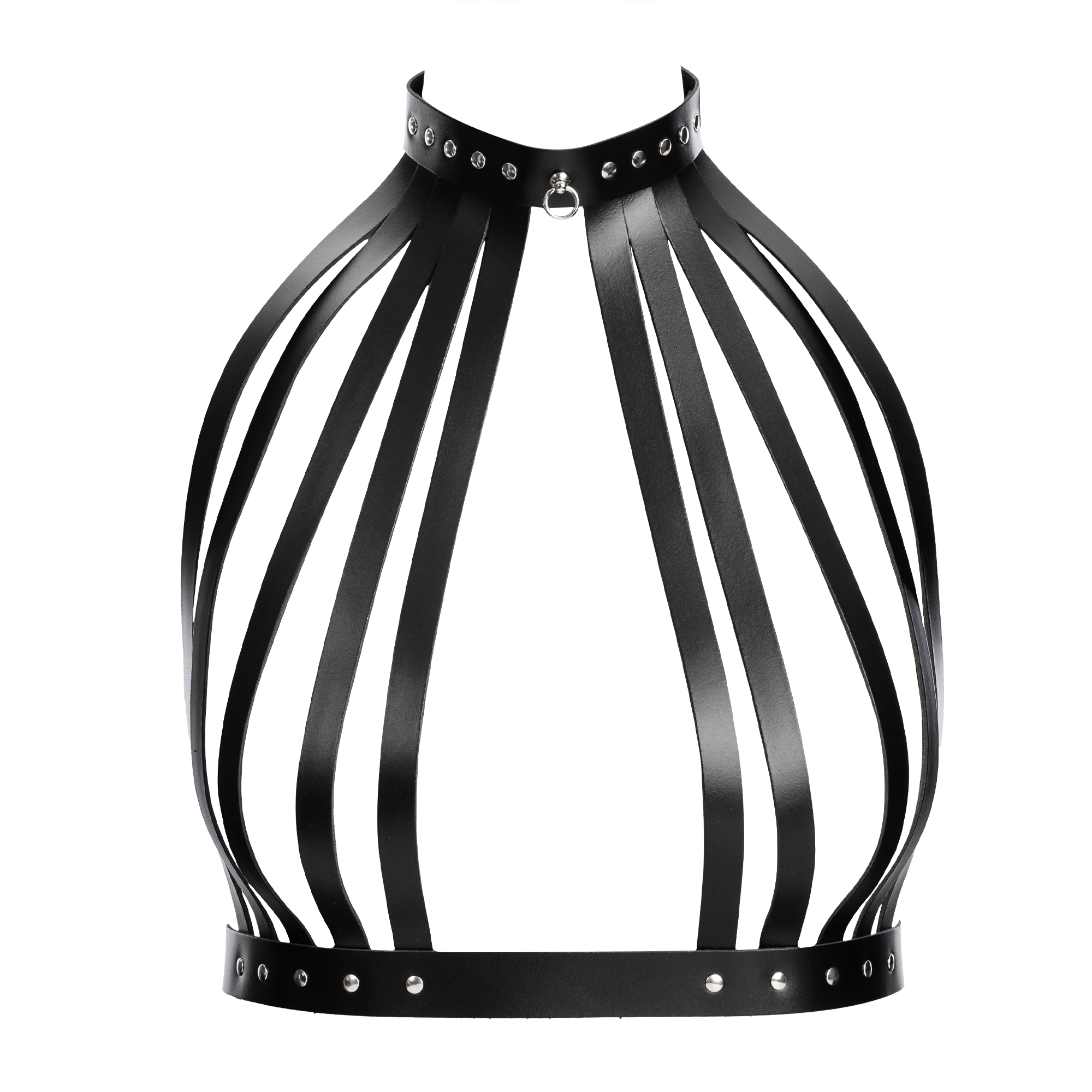 This bra with collar is handmade from genuine split leather and is finished with metal studs and an o-ring.