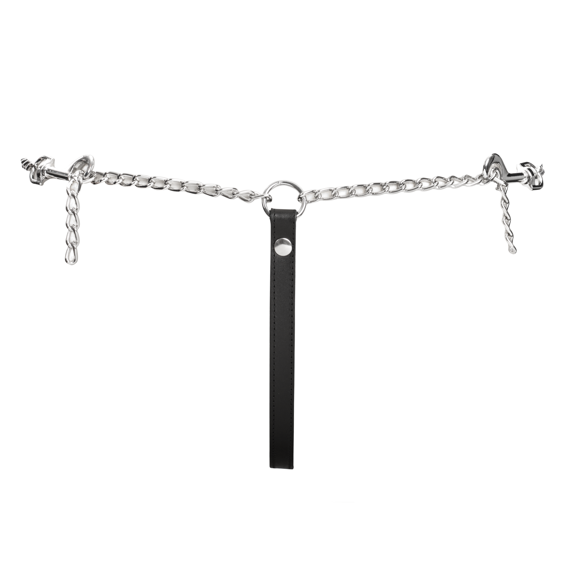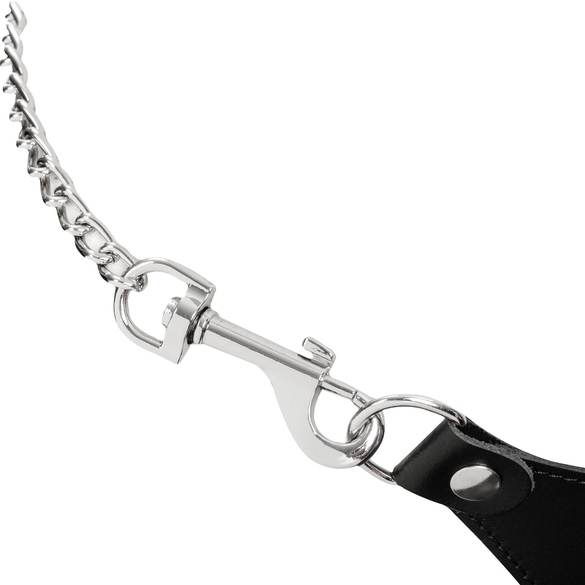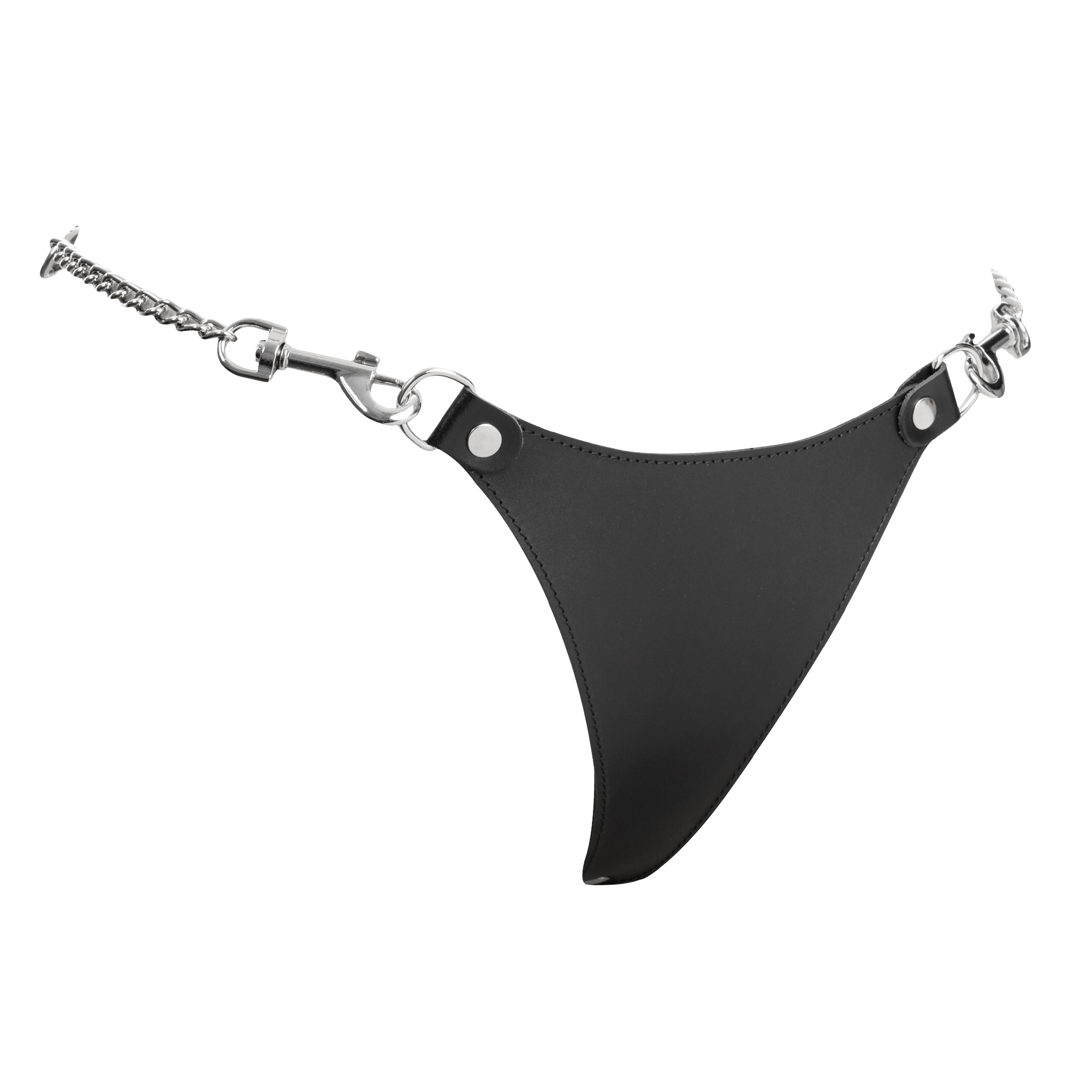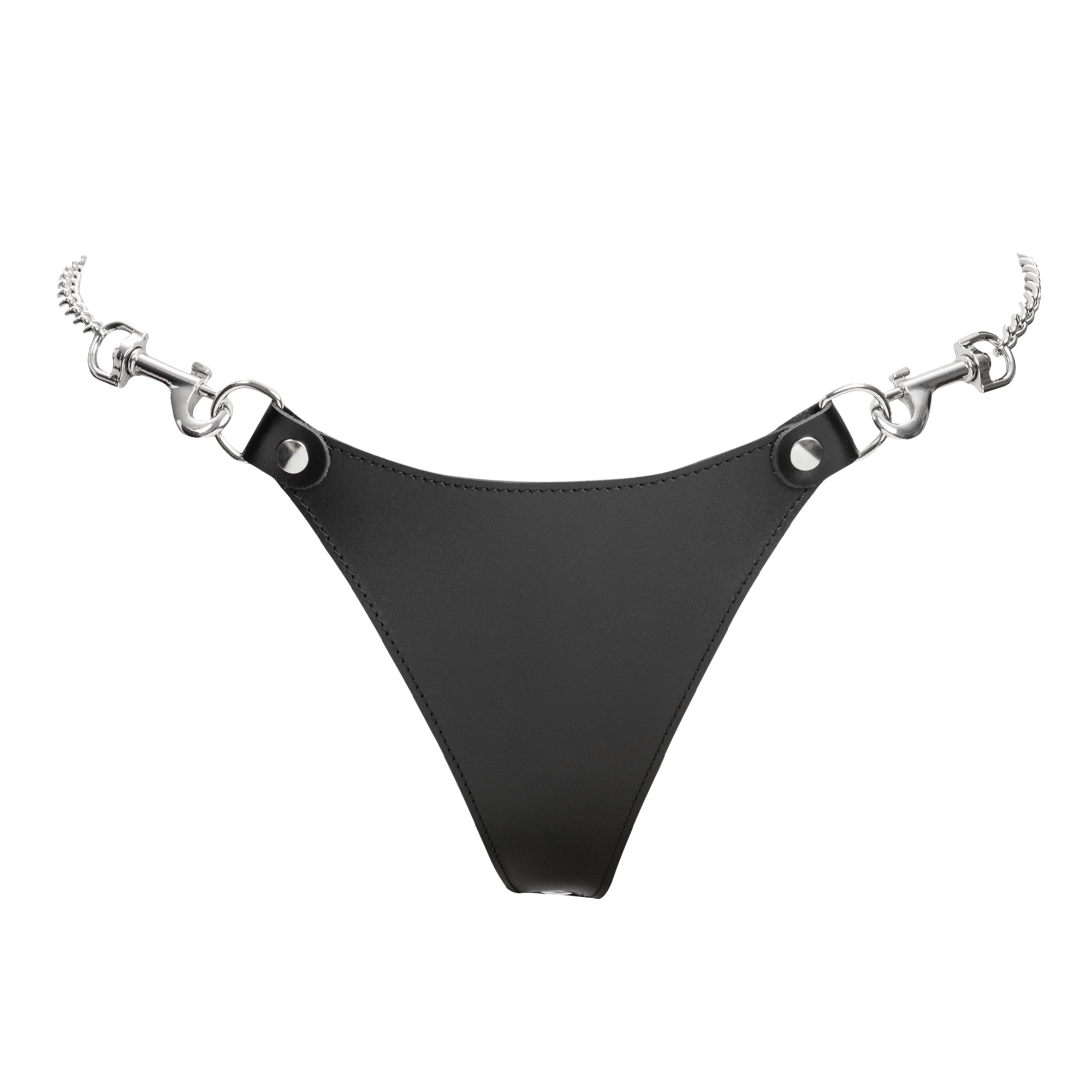 Rimba Bondage Play - Leather G-string with Detachable Chains - Black & Silver