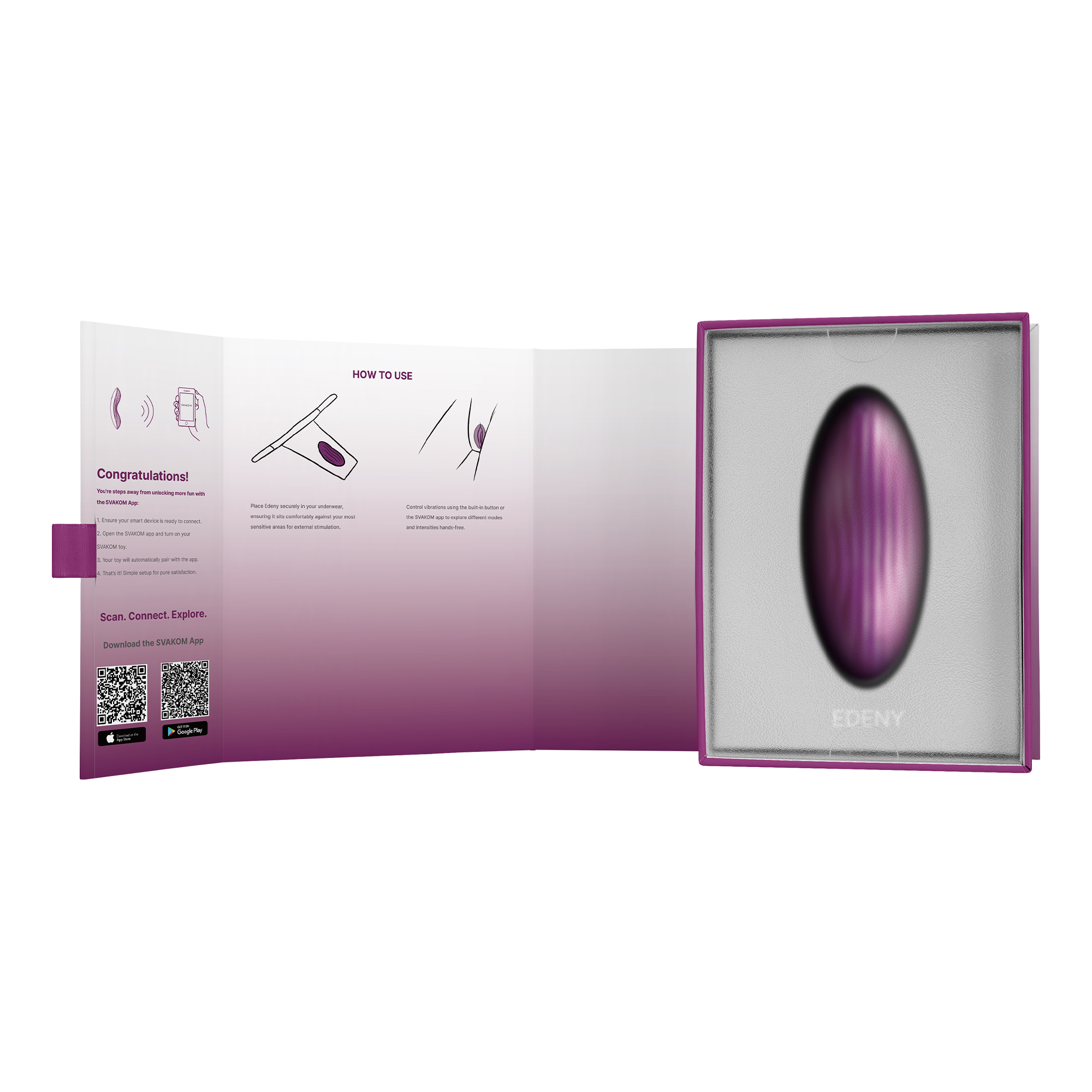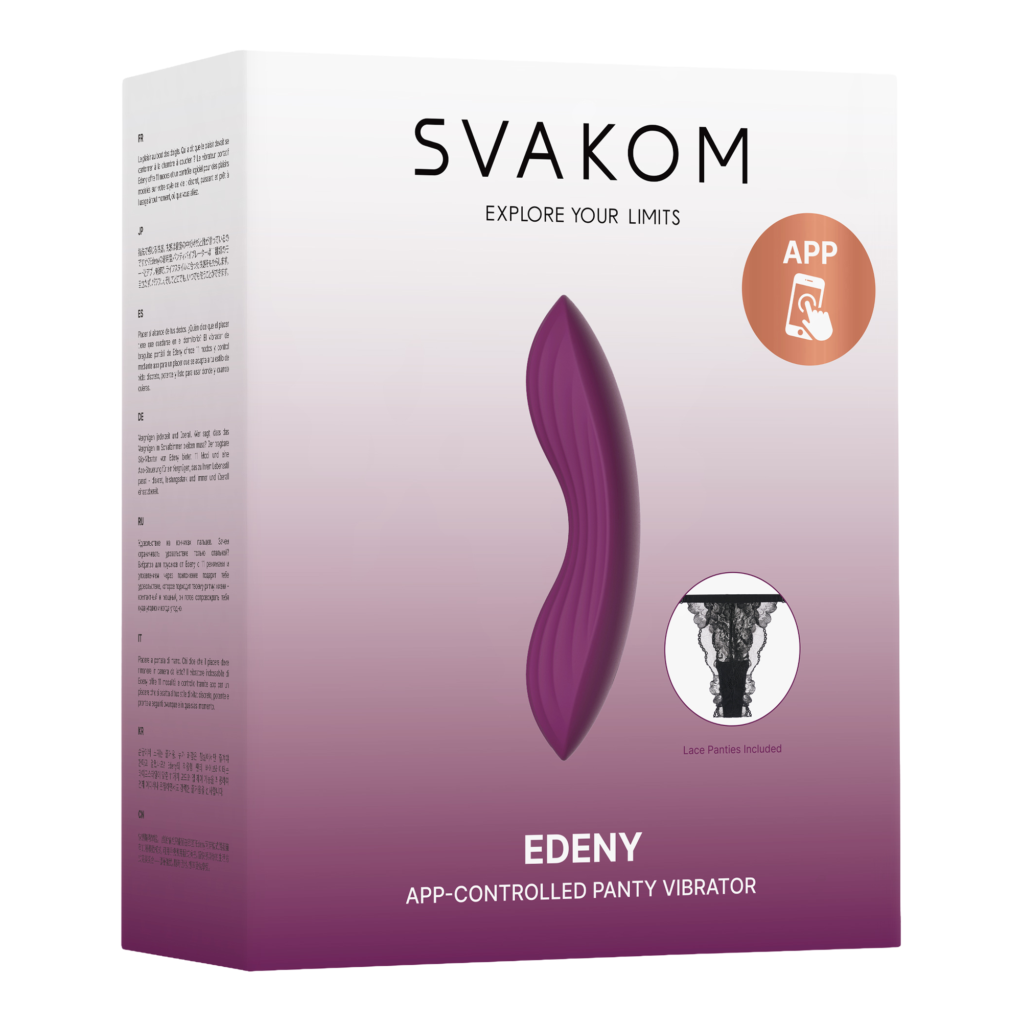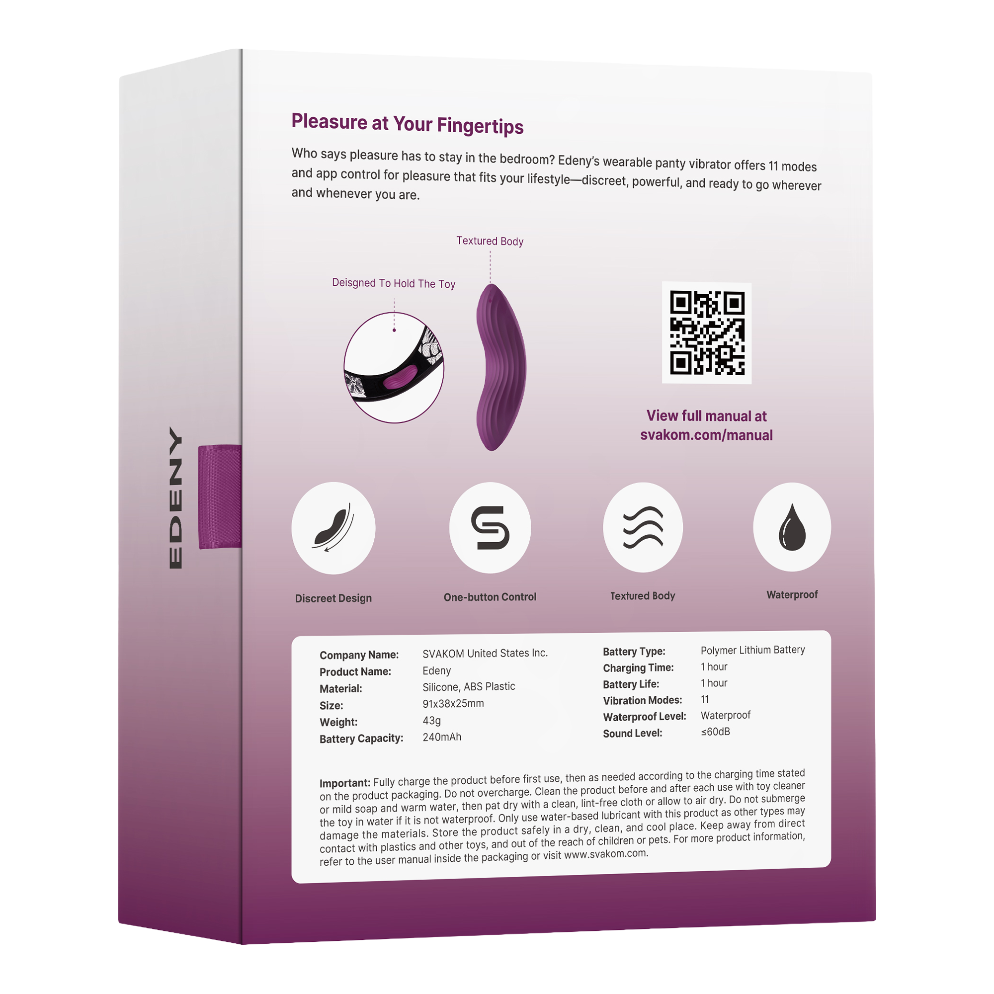 Experimente la mezcla entre lujuria y lujo con SVAKOM Edeny, el estimulador de clítoris más nuevo controlado por aplicación. Ya sea que esté en una relación a larga distancia o esté buscando diversión adicional en una sesión en solitario, ¡las posibilidades son infinitas! El seductor diseño en forma de lengua se integra perfectamente en tu zona íntima y la estructura curva asegura una diversión sin fin. El diseño acanalado de este estimulador de clítoris proporciona una experiencia aún más intensa. A través de la aplicación Svakom, usted o su pareja pueden tomar el control y disfrutar de Edeny donde quiera que estén, cuando quieran. Edeny es un juguete de alta tecnología con 11 opciones de vibración diferentes que estimulan todos los rincones de tu lugar íntimo. Gracias a los lazos en el costado de los calzoncillos, Edeny es usable para todos. Edeny está lista para darte el toque vibrante que te mereces.