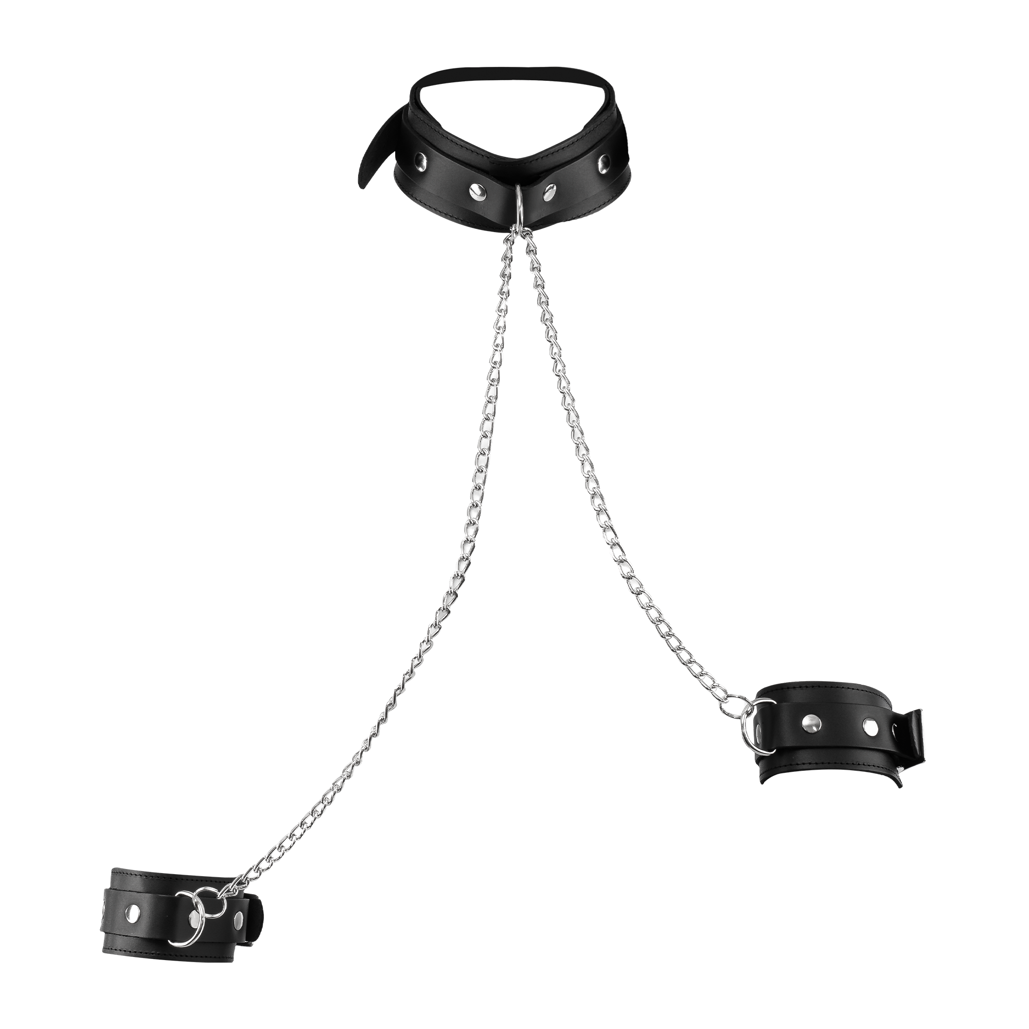 Las esposas para las manos están unidas al collar mediante una cadena metálica.