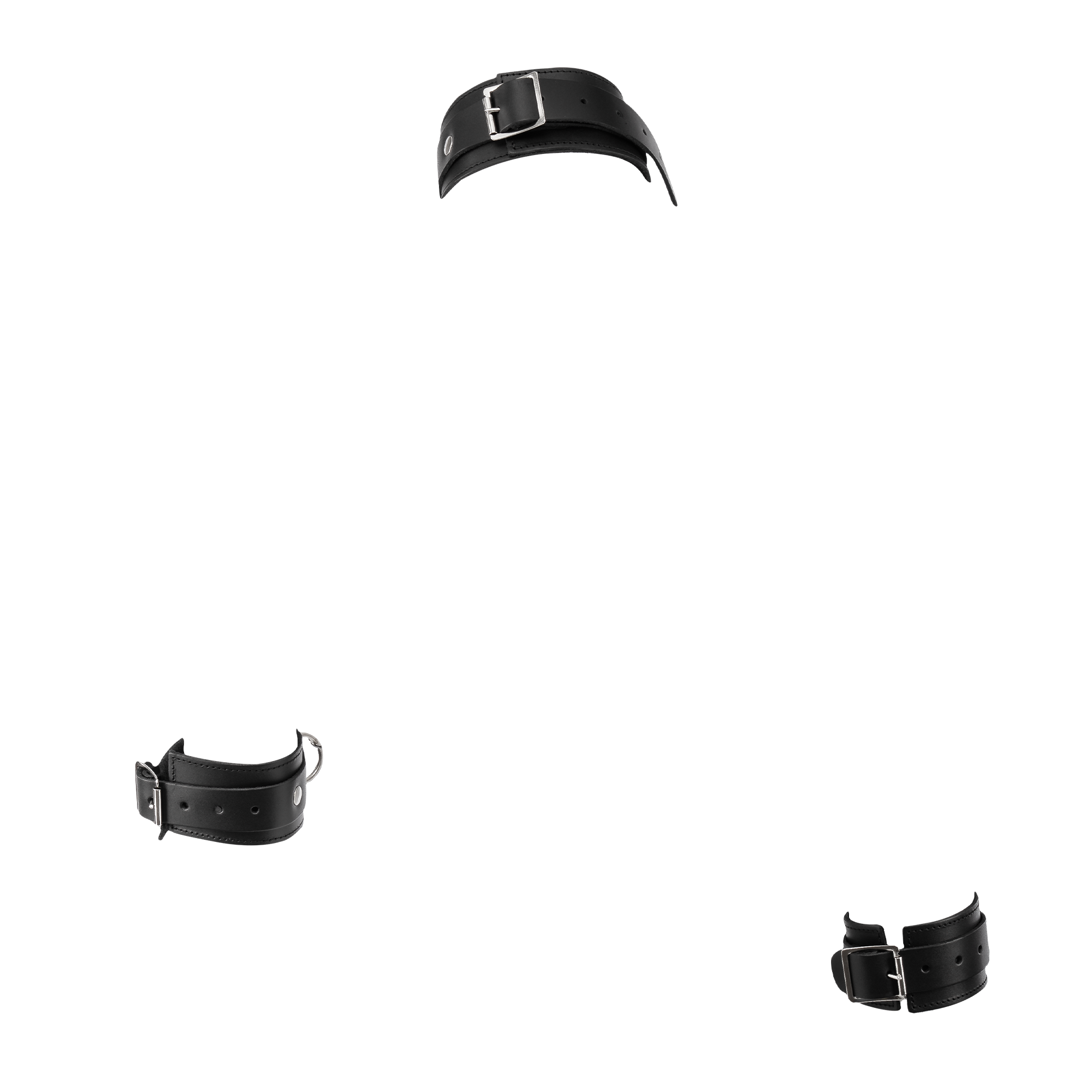 Las esposas para el cuello y las muñecas son ajustables mediante hebillas metálicas.