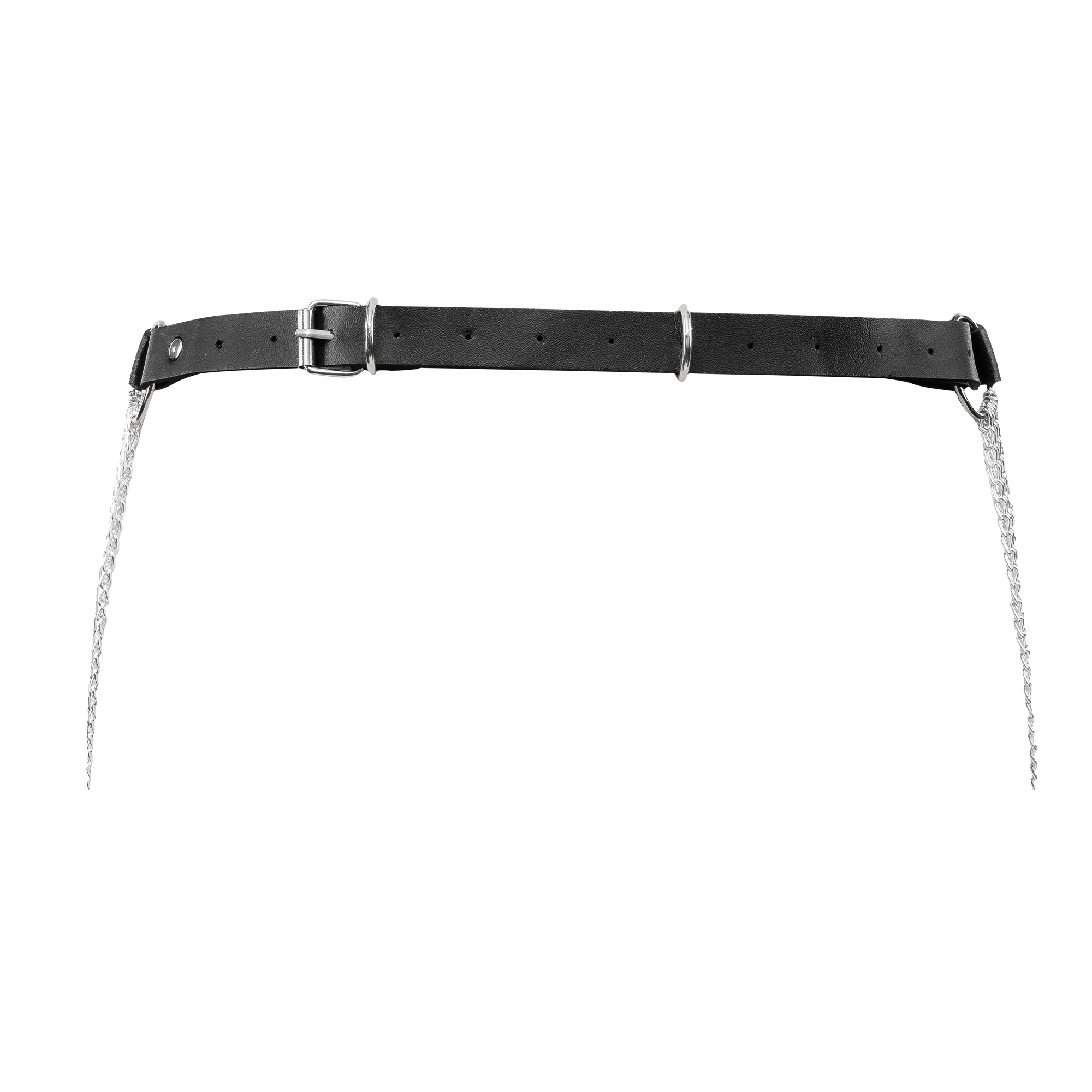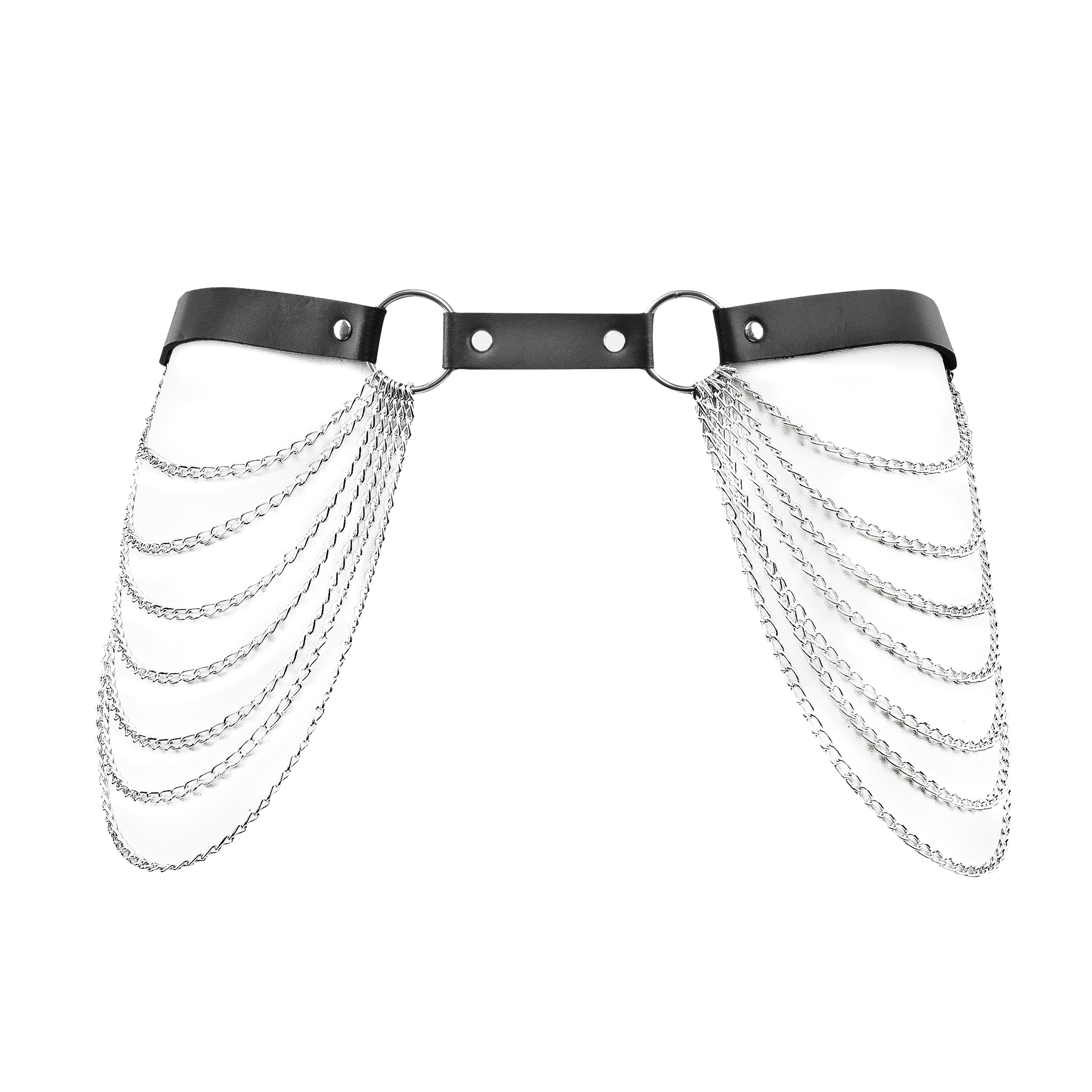 Ce porte-jarretelles est en similicuir doux à l'intérieur et orné de chaînes métalliques sans nickel.