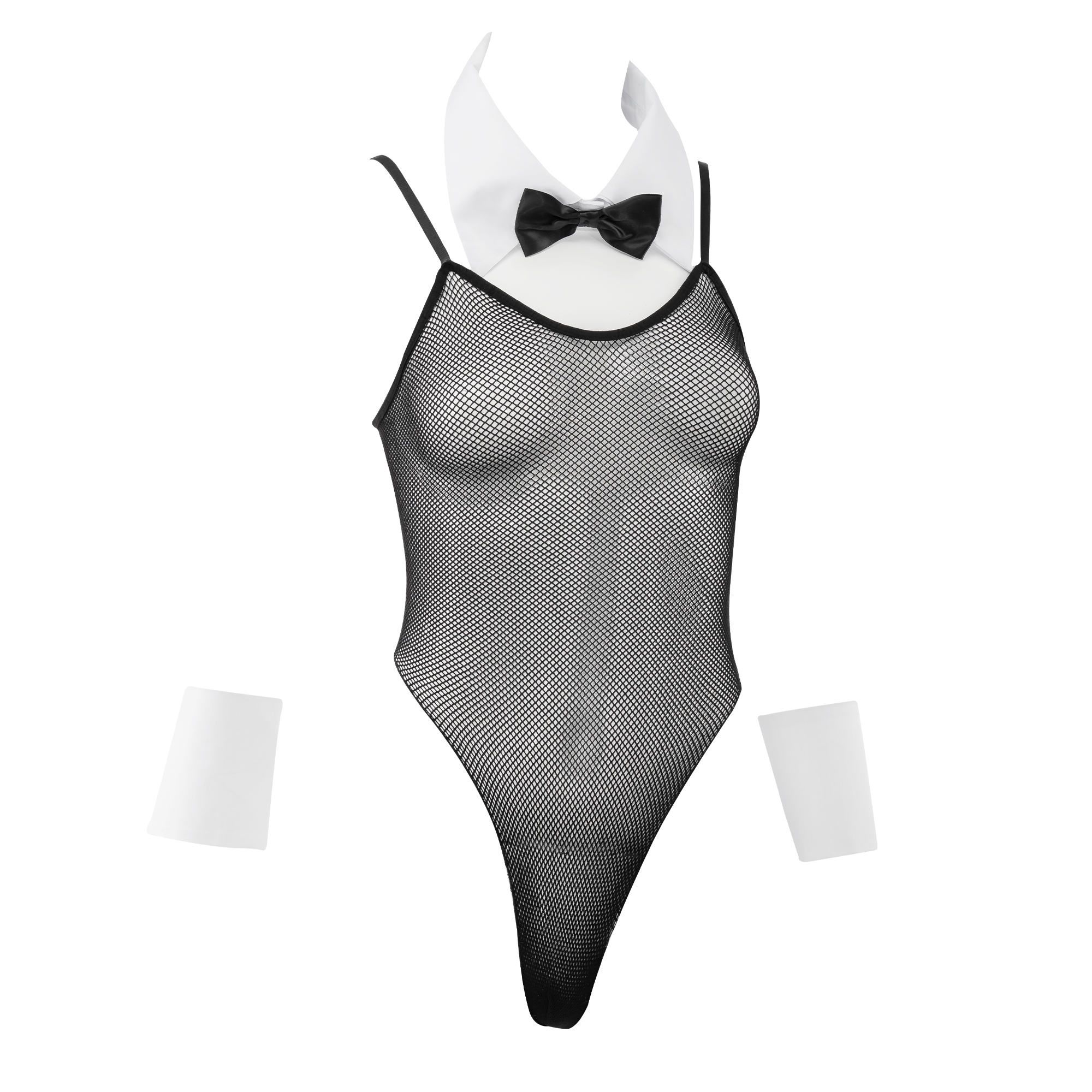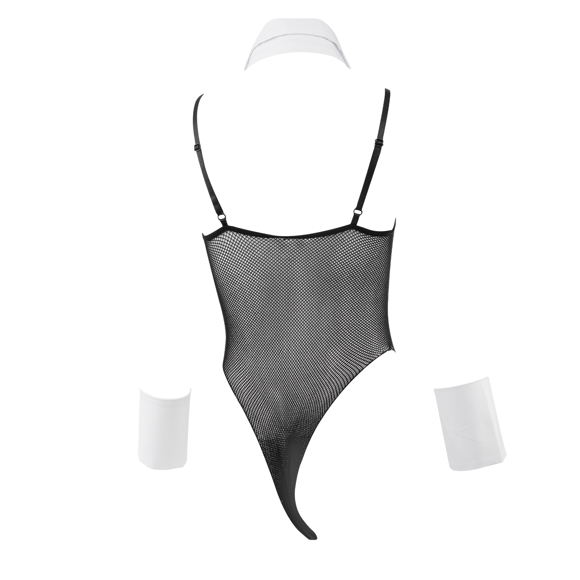 Le body de cet ensemble 4 pièces est en résille douce et extensible.