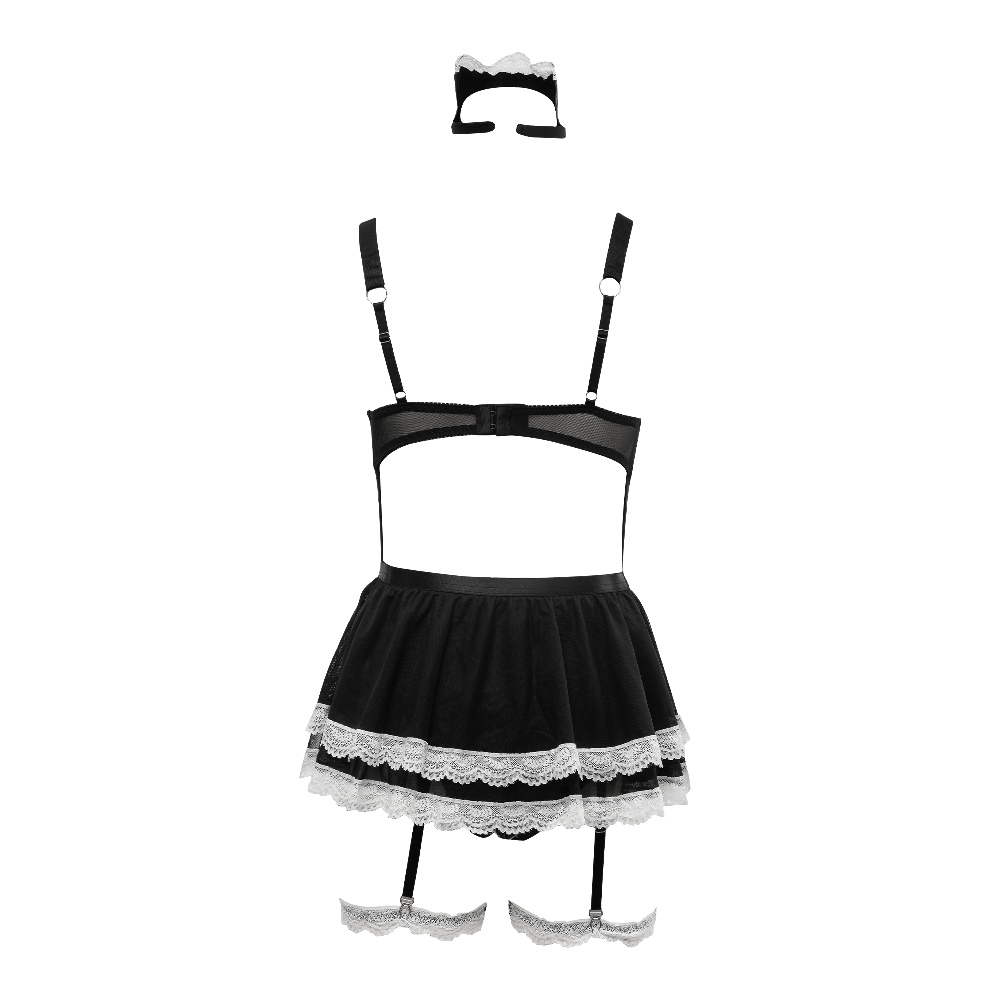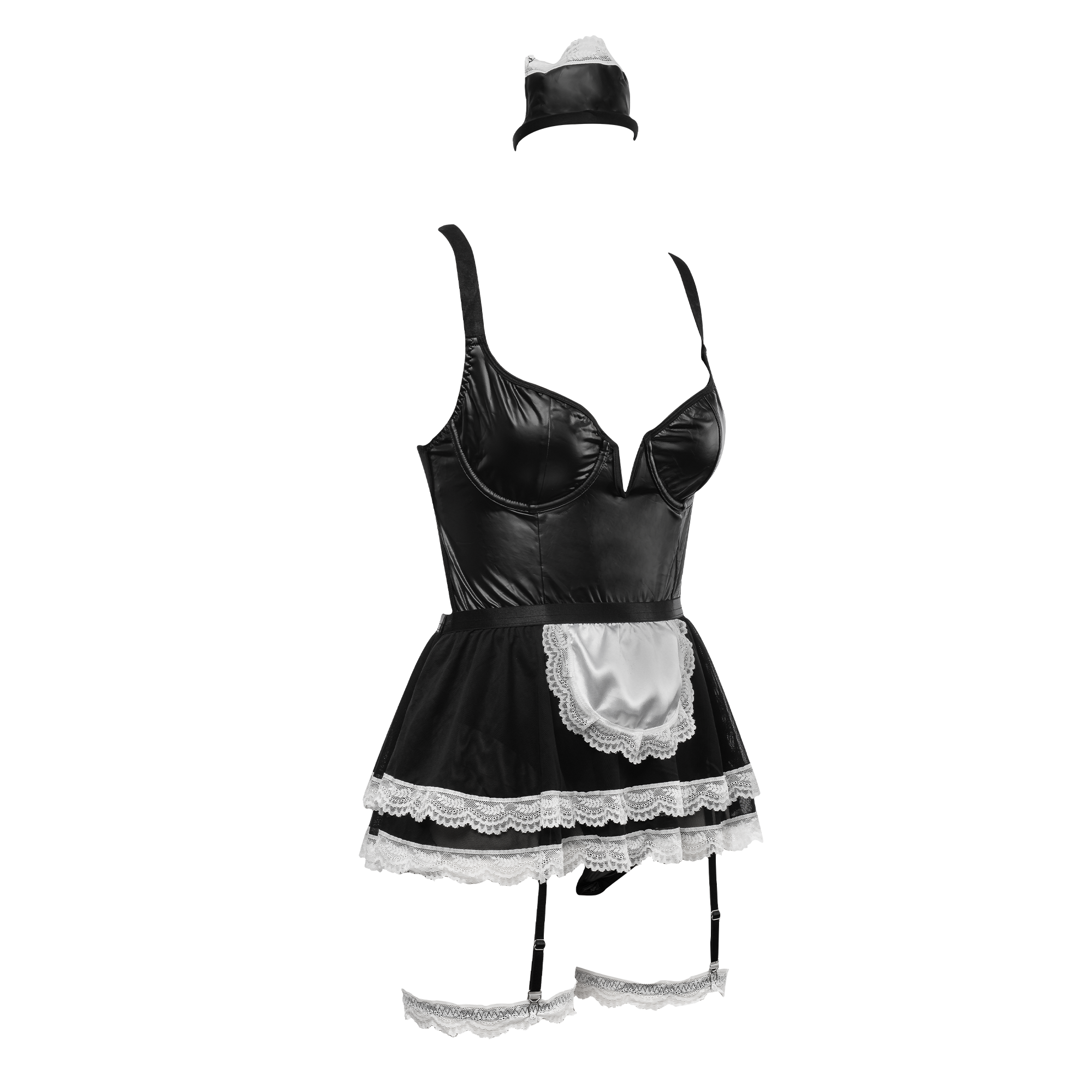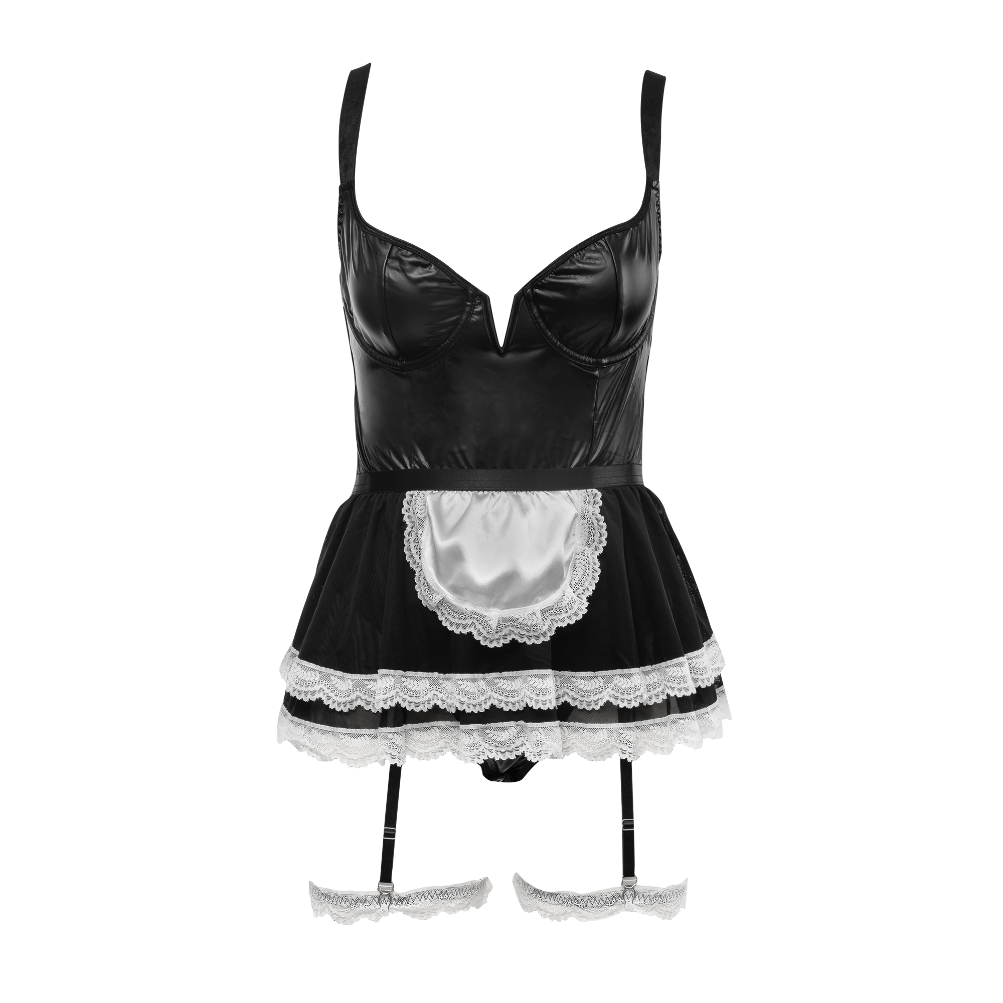 Uniforme de soubrette effet mouillé comprenant : body, jupe avec tablier, jarretelles et diadème