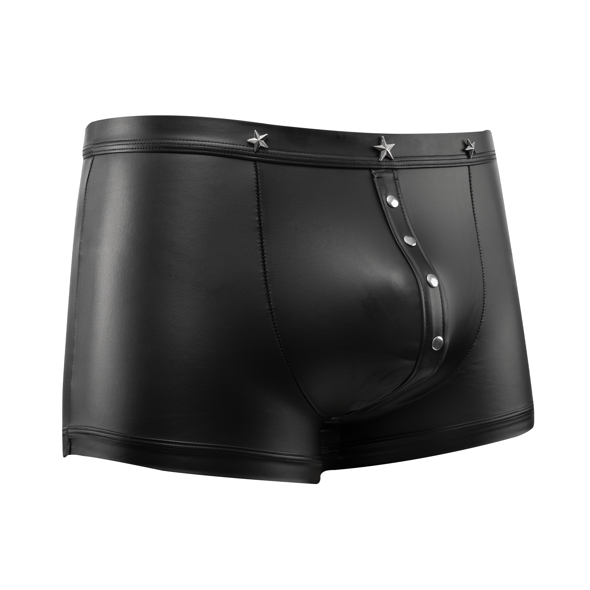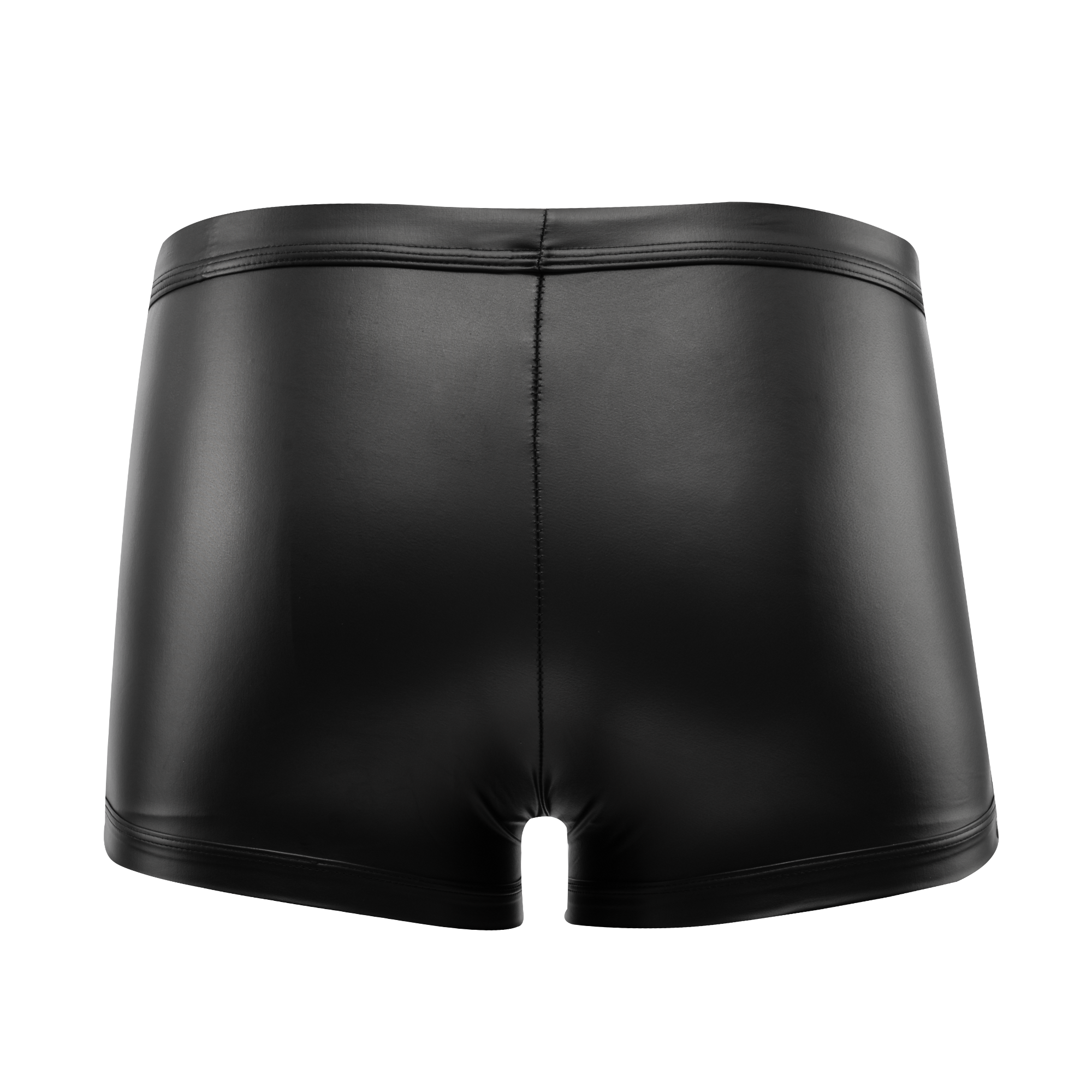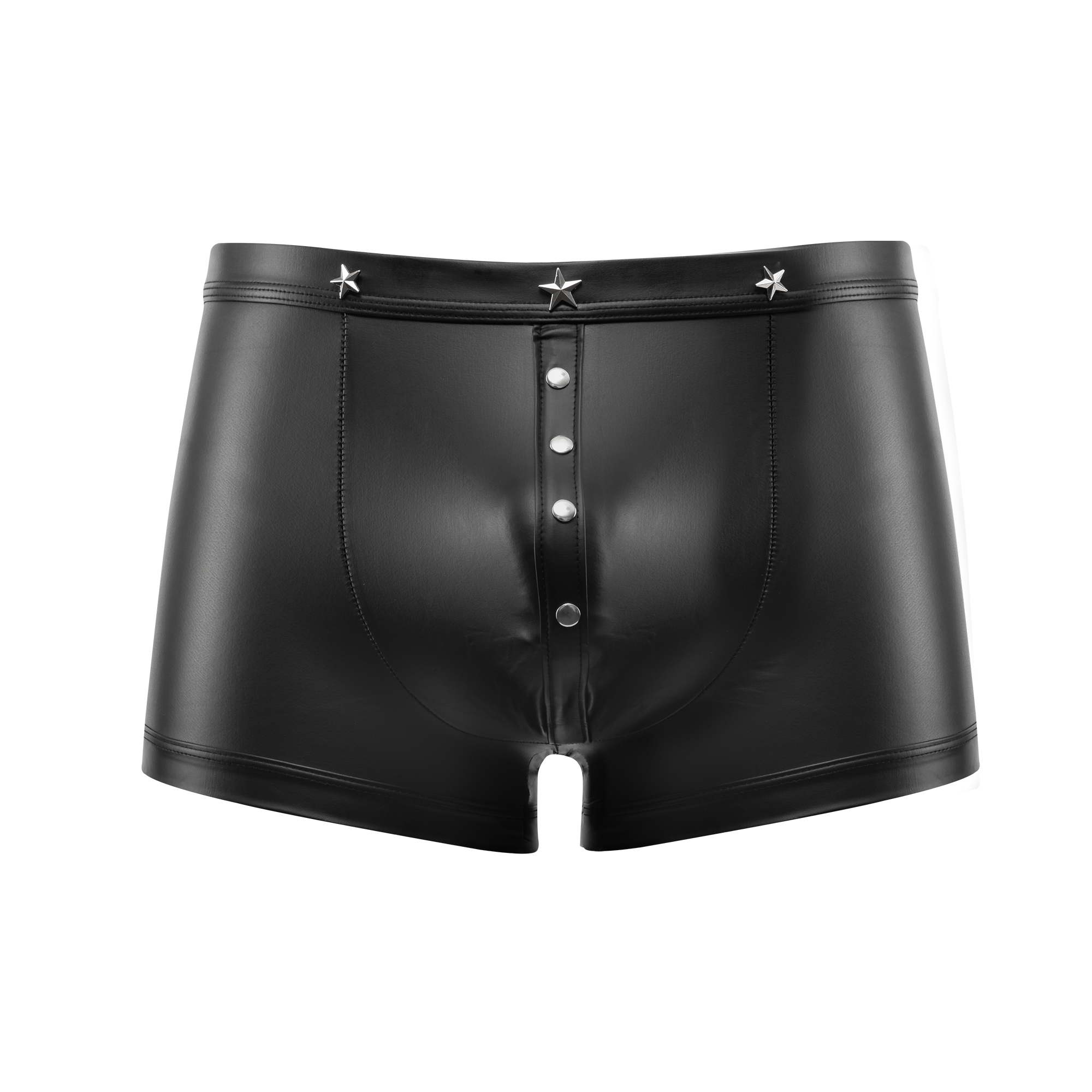 Ce short est confectionné en matière effet mouillé extensible et présente des décorations argentées sur le devant.