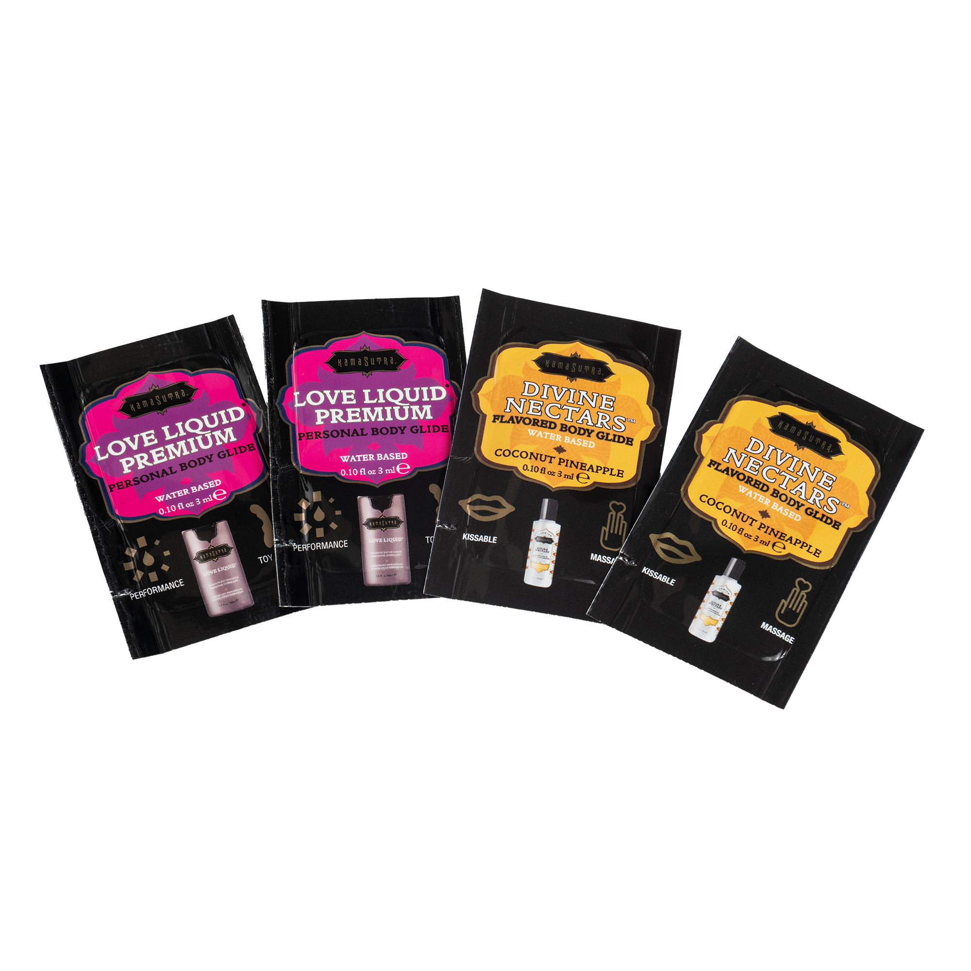 - 2 paquets de Nectars Divins : Lubrifiant à base d'eau au goût délicieux, parfait pour le sexe oral et plus encore. Contenu : 3 ml.