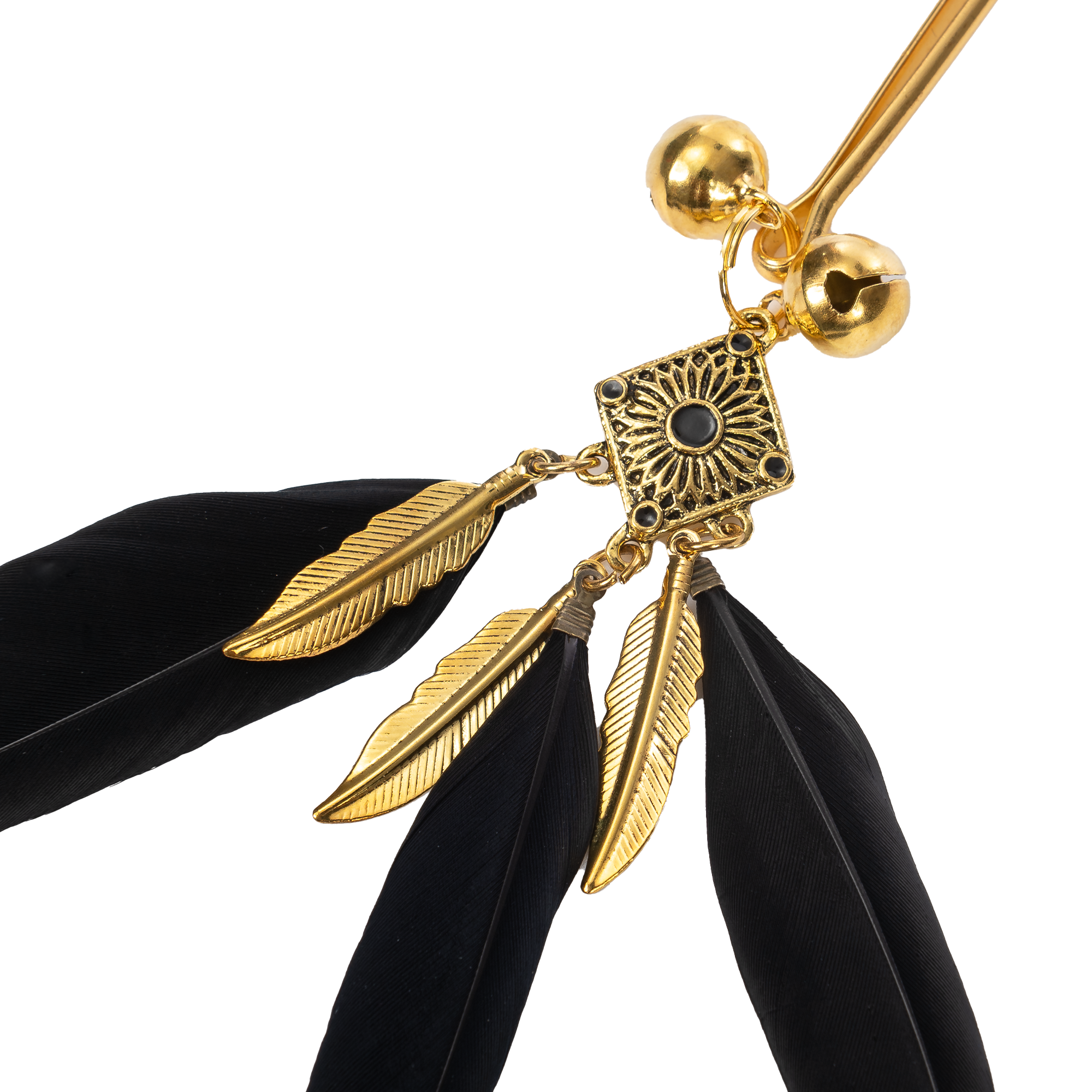 - Versierd met belletjes en een ornament met kleine gouden en grote zwarte veren