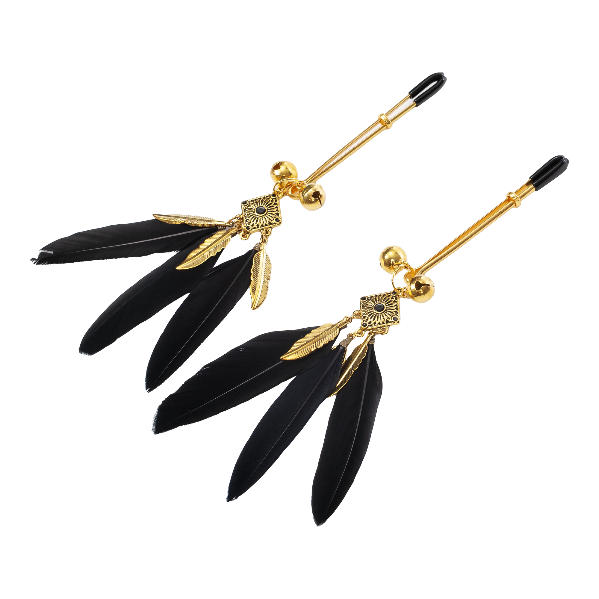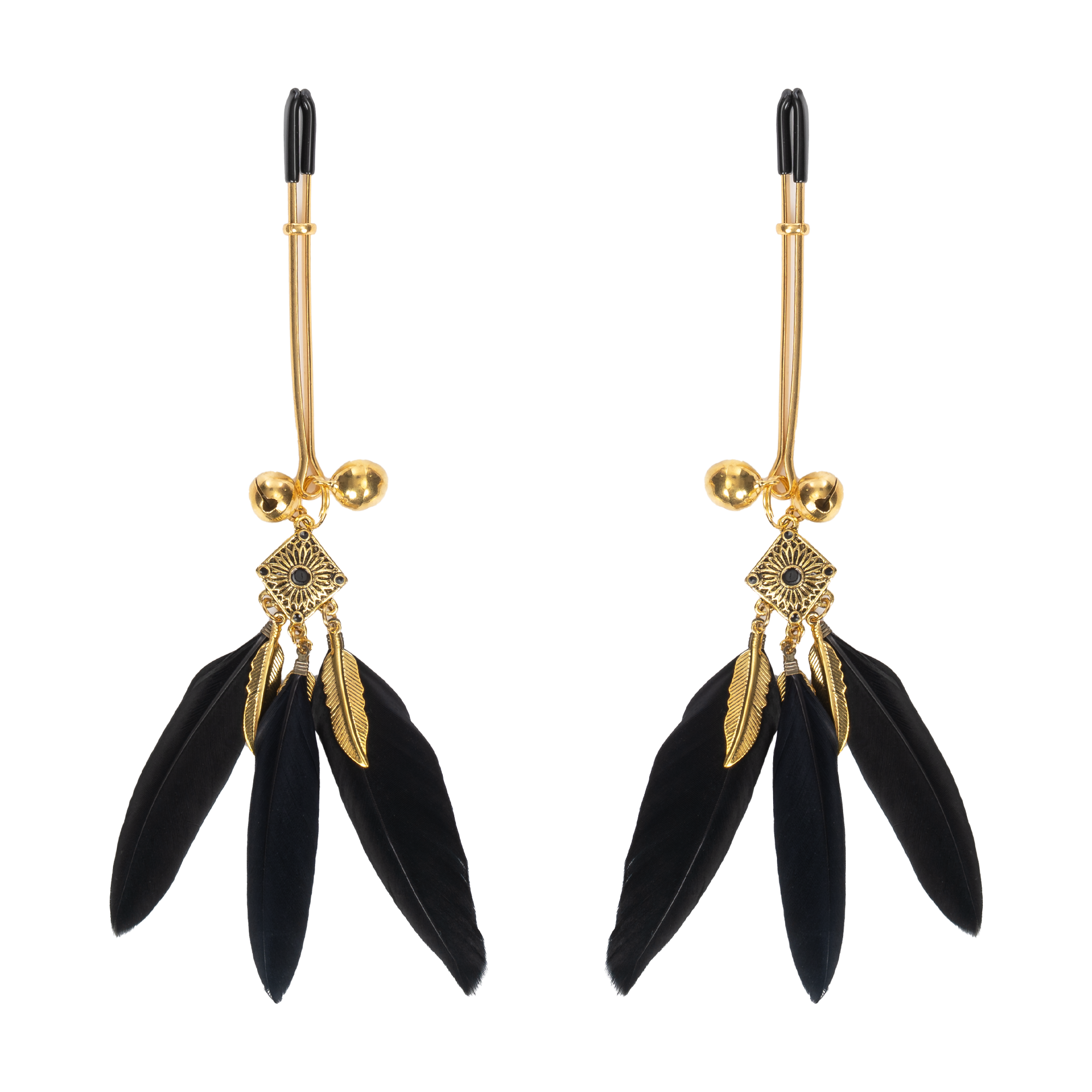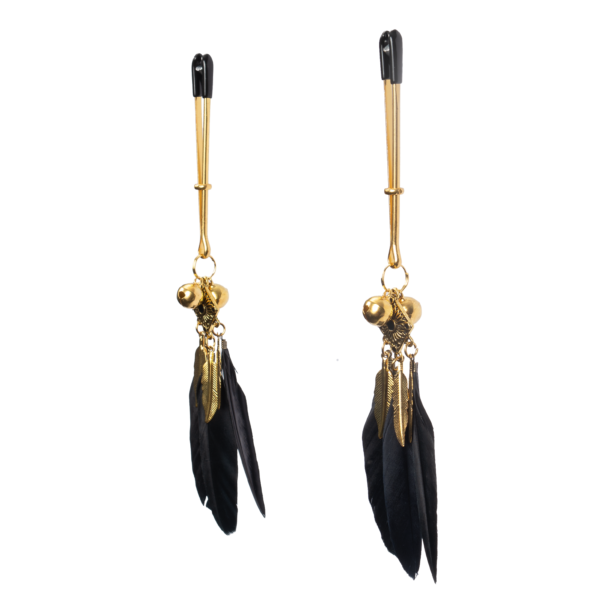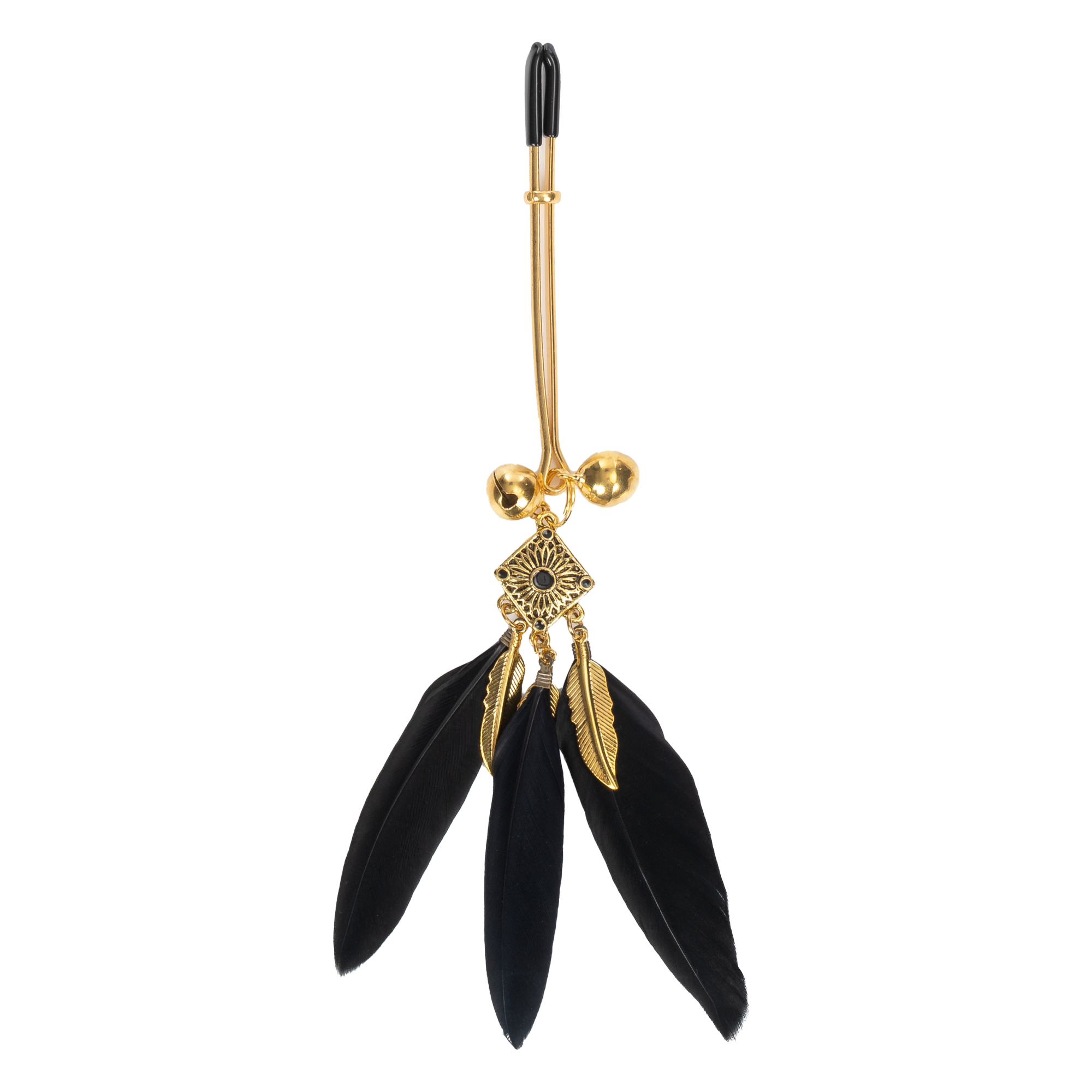 Rimba Bondage Play - Tepelklemmen met veren - Zwart & Goud