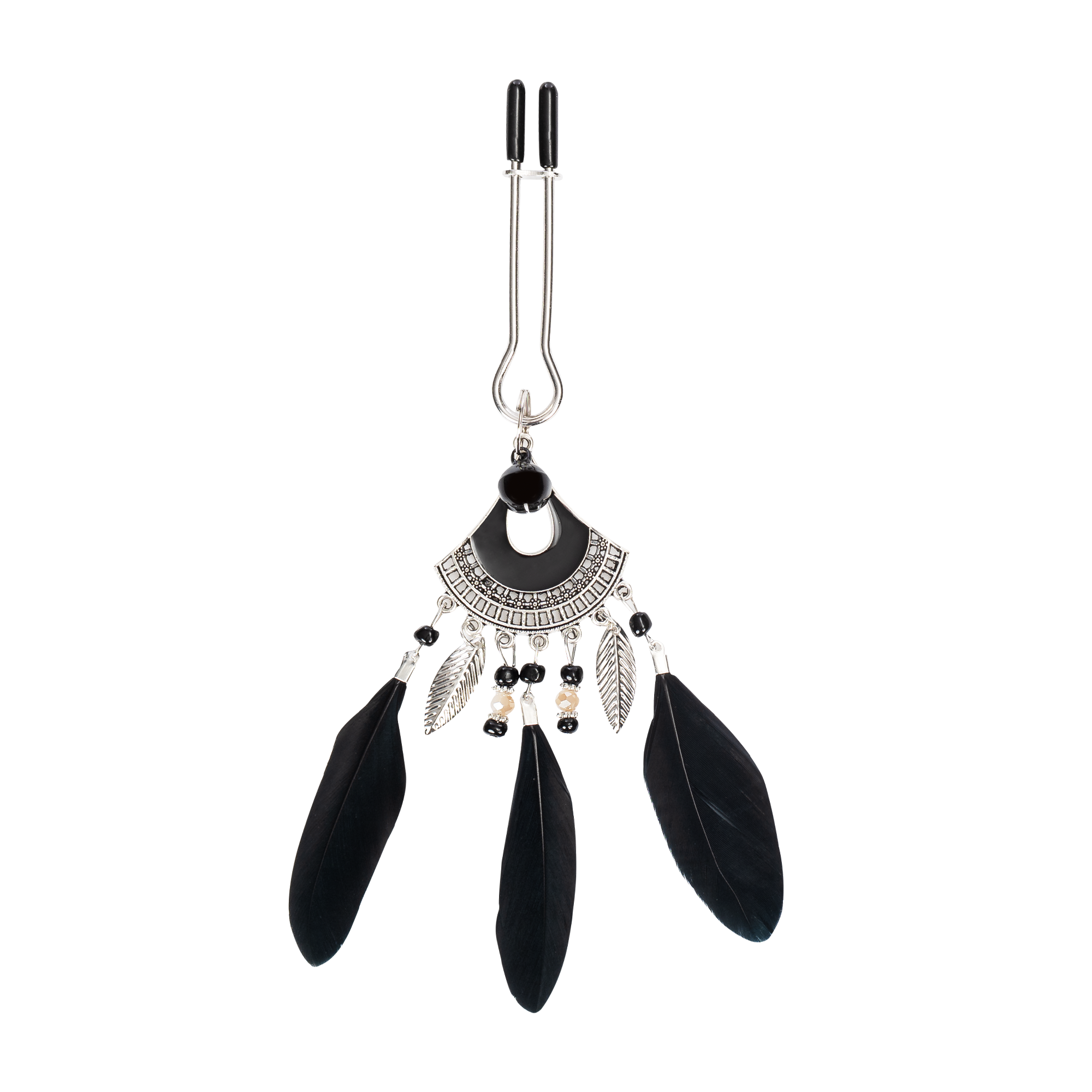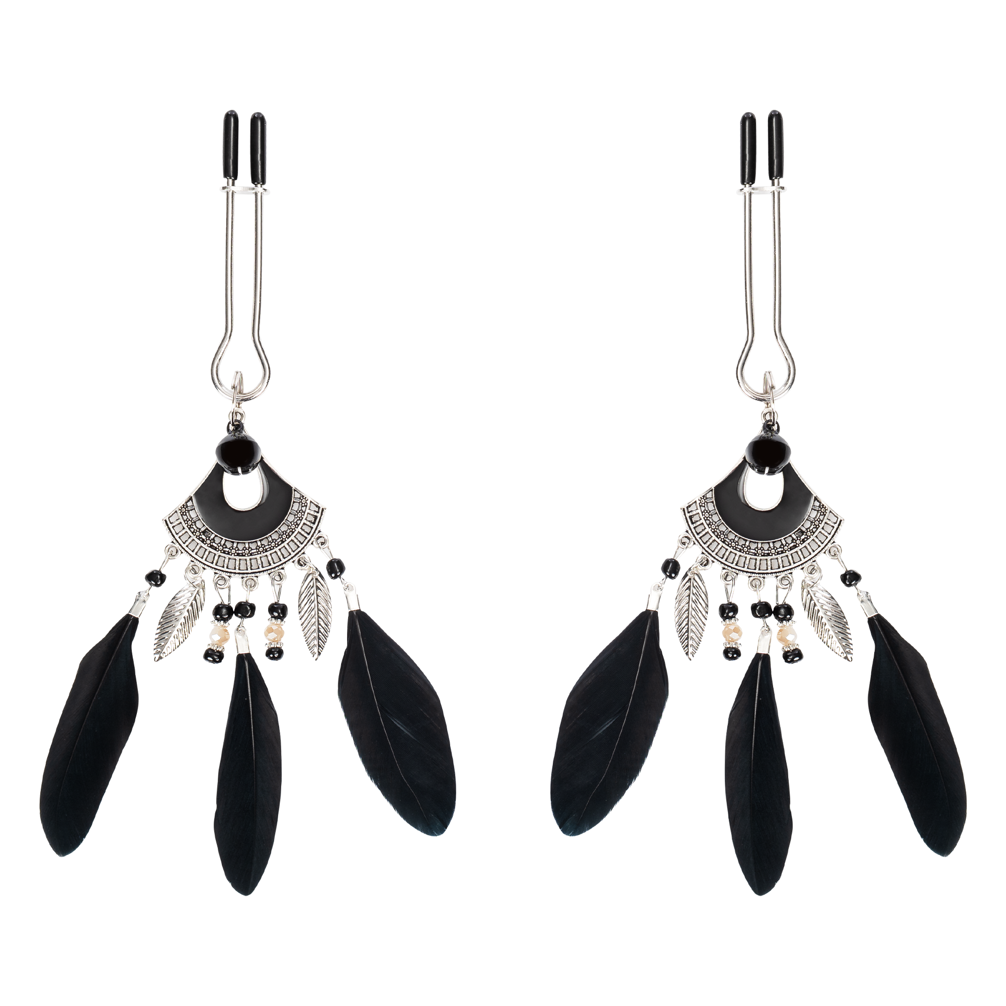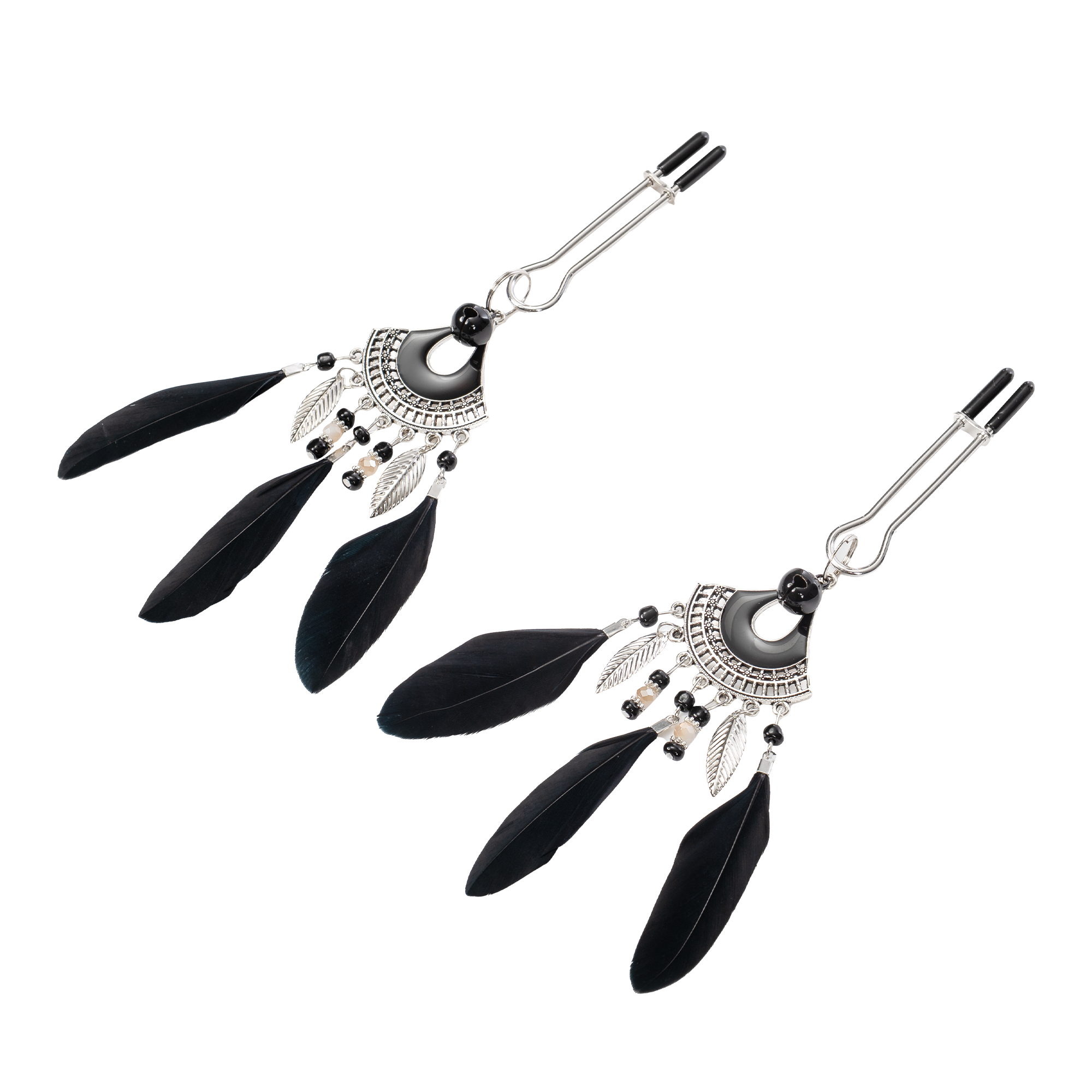 Rimba Bondage Play - Tepelklemmen met veren - Zwart & Zilver